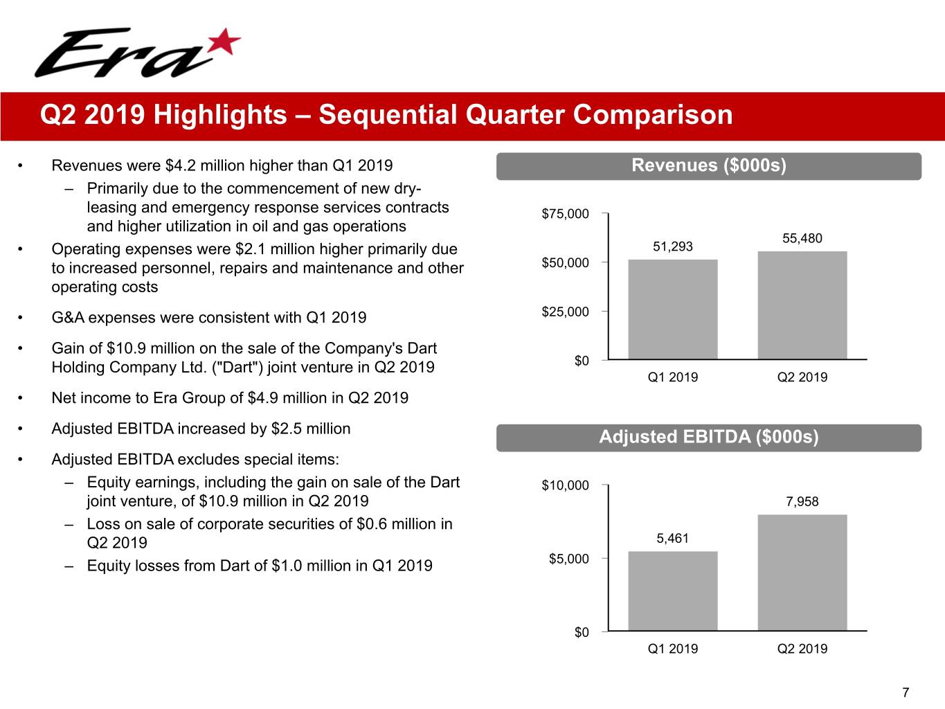 Q2 2019 Highlights – Sequential Quarter Comparison • Revenues were $4.2 million higher than Q1 2019 Revenues ($000s) – Primarily due to the commencement of new dry- leasing and emergency response services contracts $75,000 and higher utilization in oil and gas operations 55,480 • Operating expenses were $2.1 million higher primarily due 51,293 to increased personnel, repairs and maintenance and other $50,000 operating costs • G&A expenses were consistent with Q1 2019 $25,000 • Gain of $10.9 million on the sale of the Company's Dart Holding Company Ltd. ("Dart") joint venture in Q2 2019 $0 Q1 2019 Q2 2019 • Net income to Era Group of $4.9 million in Q2 2019 • Adjusted EBITDA increased by $2.5 million Adjusted EBITDA ($000s) • Adjusted EBITDA excludes special items: – Equity earnings, including the gain on sale of the Dart $10,000 joint venture, of $10.9 million in Q2 2019 7,958 – Loss on sale of corporate securities of $0.6 million in Q2 2019 5,461 – Equity losses from Dart of $1.0 million in Q1 2019 $5,000 $0 Q1 2019 Q2 2019 7