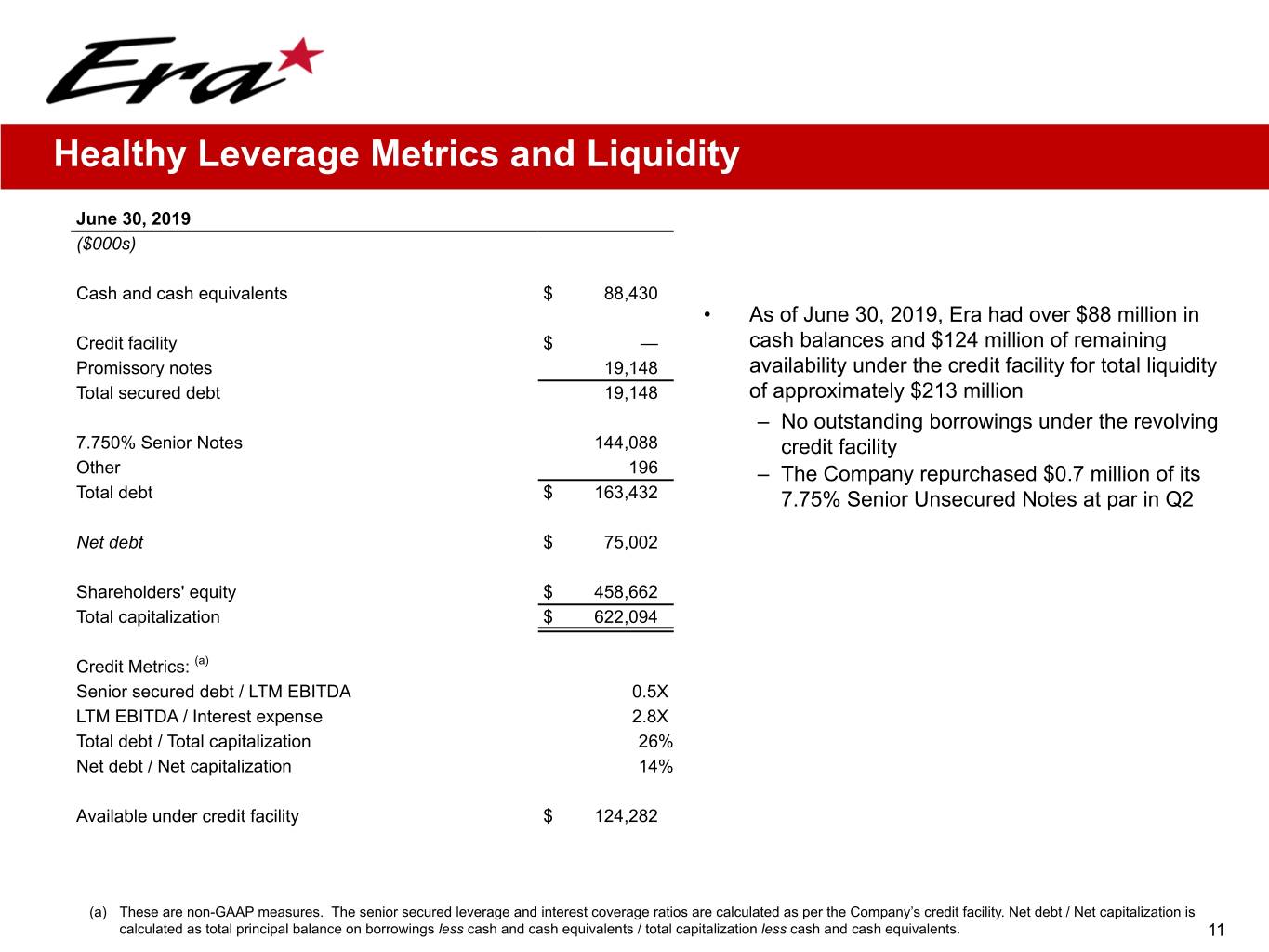 Healthy Leverage Metrics and Liquidity June 30, 2019 ($000s) Cash and cash equivalents $ 88,430 • As of June 30, 2019, Era had over $88 million in Credit facility $ — cash balances and $124 million of remaining Promissory notes 19,148 availability under the credit facility for total liquidity Total secured debt 19,148 of approximately $213 million – No outstanding borrowings under the revolving 7.750% Senior Notes 144,088 credit facility Other 196 – The Company repurchased $0.7 million of its Total debt $ 163,432 7.75% Senior Unsecured Notes at par in Q2 Net debt $ 75,002 Shareholders' equity $ 458,662 Total capitalization $ 622,094 Credit Metrics: (a) Senior secured debt / LTM EBITDA 0.5X LTM EBITDA / Interest expense 2.8X Total debt / Total capitalization 26% Net debt / Net capitalization 14% Available under credit facility $ 124,282 (a) These are non-GAAP measures. The senior secured leverage and interest coverage ratios are calculated as per the Company’s credit facility. Net debt / Net capitalization is calculated as total principal balance on borrowings less cash and cash equivalents / total capitalization less cash and cash equivalents. 11