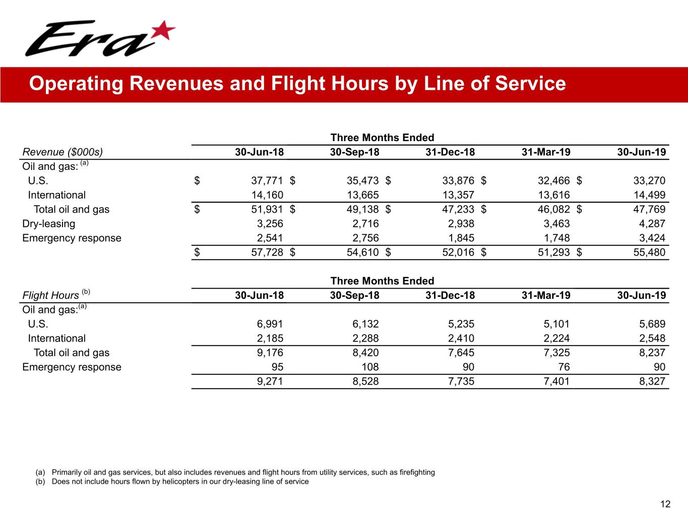 Operating Revenues and Flight Hours by Line of Service Three Months Ended Revenue ($000s) 30-Jun-18 30-Sep-18 31-Dec-18 31-Mar-19 30-Jun-19 (a) Oil and gas: U.S. $ 37,771 $ 35,473 $ 33,876 $ 32,466 $ 33,270 International 14,160 13,665 13,357 13,616 14,499 Total oil and gas $ 51,931 $ 49,138 $ 47,233 $ 46,082 $ 47,769 Dry-leasing 3,256 2,716 2,938 3,463 4,287 Emergency response 2,541 2,756 1,845 1,748 3,424 $ 57,728 $ 54,610 $ 52,016 $ 51,293 $ 55,480 Three Months Ended Flight Hours (b) 30-Jun-18 30-Sep-18 31-Dec-18 31-Mar-19 30-Jun-19 Oil and gas:(a) U.S. 6,991 6,132 5,235 5,101 5,689 International 2,185 2,288 2,410 2,224 2,548 Total oil and gas 9,176 8,420 7,645 7,325 8,237 Emergency response 95 108 90 76 90 9,271 8,528 7,735 7,401 8,327 (a) Primarily oil and gas services, but also includes revenues and flight hours from utility services, such as firefighting (b) Does not include hours flown by helicopters in our dry-leasing line of service 12