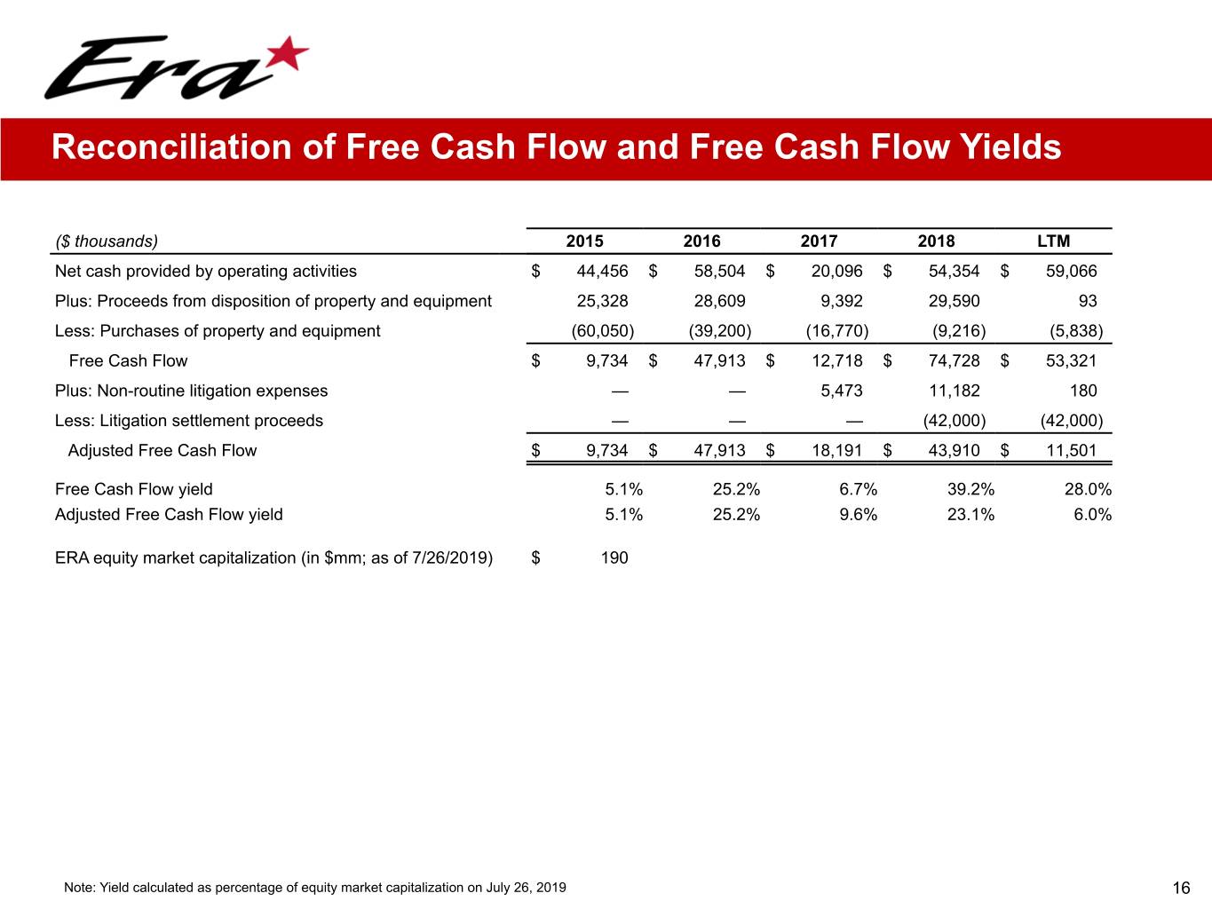 Reconciliation of Free Cash Flow and Free Cash Flow Yields ($ thousands) 2015 2016 2017 2018 LTM Net cash provided by operating activities $ 44,456 $ 58,504 $ 20,096 $ 54,354 $ 59,066 Plus: Proceeds from disposition of property and equipment 25,328 28,609 9,392 29,590 93 Less: Purchases of property and equipment (60,050) (39,200) (16,770) (9,216) (5,838) Free Cash Flow $ 9,734 $ 47,913 $ 12,718 $ 74,728 $ 53,321 Plus: Non-routine litigation expenses — — 5,473 11,182 180 Less: Litigation settlement proceeds — — — (42,000) (42,000) Adjusted Free Cash Flow $ 9,734 $ 47,913 $ 18,191 $ 43,910 $ 11,501 Free Cash Flow yield 5.1% 25.2% 6.7% 39.2% 28.0% Adjusted Free Cash Flow yield 5.1% 25.2% 9.6% 23.1% 6.0% ERA equity market capitalization (in $mm; as of 7/26/2019) $ 190 Note: Yield calculated as percentage of equity market capitalization on July 26, 2019 16