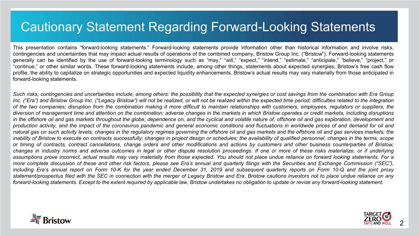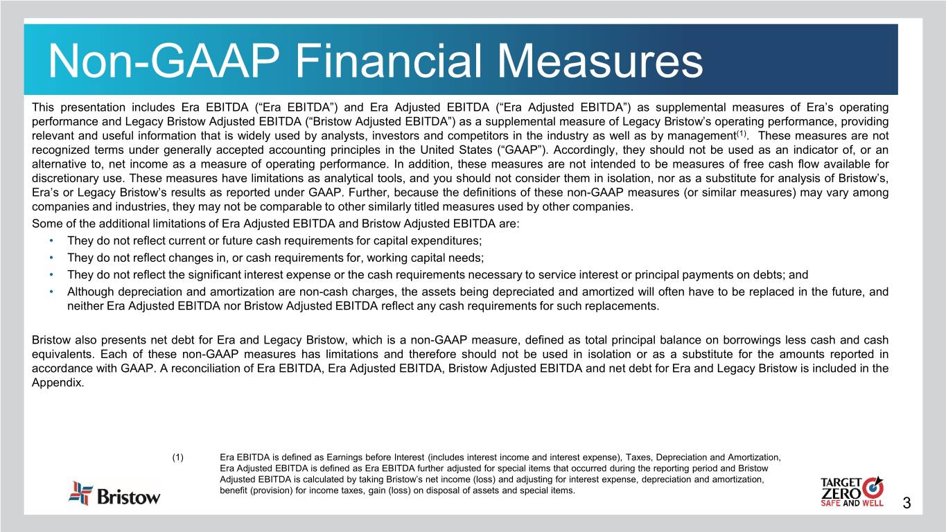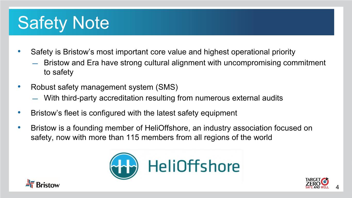 Cautionary Statement Regarding Forward-Looking Statements This presentation contains “forward-looking statements.” Forward-looking statements provide information other than historical information and involve risks, contingencies and uncertainties that may impact actual results of operations of the combined company, Bristow Group Inc. (“Bristow”). Forward-looking statements generally can be identified by the use of forward-looking terminology such as “may,” “will,” “expect,” “intend,” “estimate,” “anticipate,” “believe,” “project,” or “continue,” or other similar words. These forward-looking statements include, among other things, statements about expected synergies, Bristow’s free cash flow profile, the ability to capitalize on strategic opportunities and expected liquidity enhancements. Bristow’s actual results may vary materially from those anticipated in forward-looking statements. Such risks, contingencies and uncertainties include, among others: the possibility that the expected synergies or cost savings from the combination with Era Group Inc. (“Era”) and Bristow Group Inc. (“Legacy Bristow”) will not be realized, or will not be realized within the expected time period; difficulties related to the integration of the two companies; disruption from the combination making it more difficult to maintain relationships with customers, employees, regulators or suppliers; the diversion of management time and attention on the combination; adverse changes in the markets in which Bristow operates or credit markets, including disruptions in the offshore oil and gas markets throughout the globe; dependence on, and the cyclical and volatile nature of, offshore oil and gas exploration, development and production activity, and the impact of the coronavirus pandemic and general economic conditions and fluctuations in worldwide prices of and demand for oil and natural gas on such activity levels; changes in the regulatory regimes governing the offshore oil and gas markets and the offshore oil and gas services markets; the inability of Bristow to execute on contracts successfully; changes in project design or schedules; the availability of qualified personnel, changes in the terms, scope or timing of contracts, contract cancellations, change orders and other modifications and actions by customers and other business counterparties of Bristow; changes in industry norms and adverse outcomes in legal or other dispute resolution proceedings. If one or more of these risks materialize, or if underlying assumptions prove incorrect, actual results may vary materially from those expected. You should not place undue reliance on forward looking statements. For a more complete discussion of these and other risk factors, please see Era’s annual and quarterly filings with the Securities and Exchange Commission (“SEC”), including Era’s annual report on Form 10-K for the year ended December 31, 2019 and subsequent quarterly reports on Form 10-Q and the joint proxy statement/prospectus filed with the SEC in connection with the merger of Legacy Bristow and Era. Bristow cautions investors not to place undue reliance on any forward-looking statements. Except to the extent required by applicable law, Bristow undertakes no obligation to update or revise any forward-looking statement. 2
