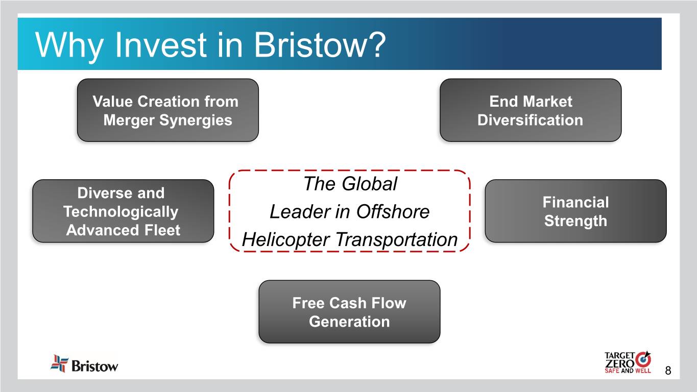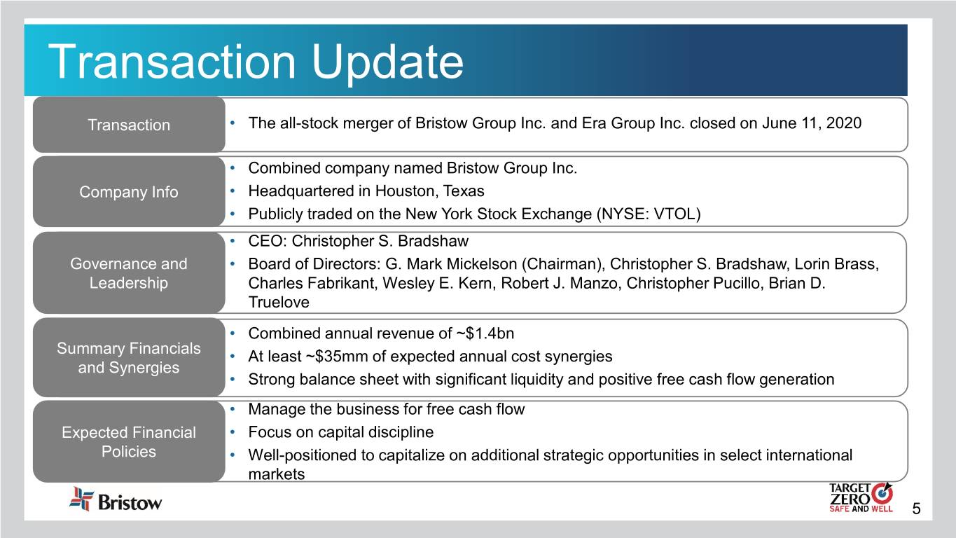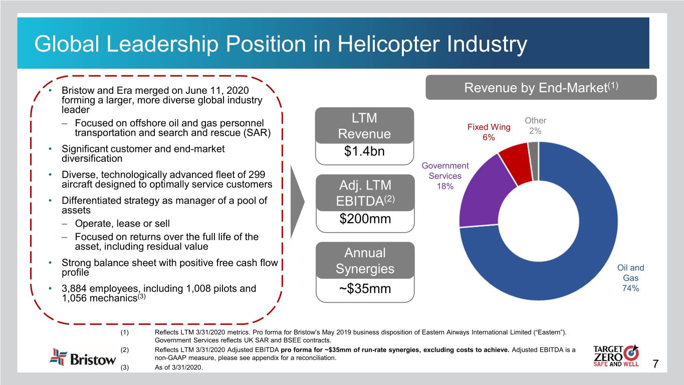Cautionary Statement Regarding Forward-Looking Statements This presentation contains “forward-looking statements.” Forward-looking statements provide information other than historical information and involve risks, contingencies and uncertainties that may impact actual results of operations of the combined company, Bristow Group Inc. (“Bristow”). Forward-looking statements generally can be identified by the use of forward-looking terminology such as “may,” “will,” “expect,” “intend,” “estimate,” “anticipate,” “believe,” “project,” or “continue,” or other similar words. These forward-looking statements include, among other things, statements about expected synergies, Bristow’s free cash flow profile, the ability to capitalize on strategic opportunities and expected liquidity enhancements. Bristow’s actual results may vary materially from those anticipated in forward-looking statements. Such risks, contingencies and uncertainties include, among others: the possibility that the expected synergies or cost savings from the combination with Era Group Inc. (“Era”) and Bristow Group Inc. (“Legacy Bristow”) will not be realized, or will not be realized within the expected time period; difficulties related to the integration of the two companies; disruption from the combination making it more difficult to maintain relationships with customers, employees, regulators or suppliers; the diversion of management time and attention on the combination; adverse changes in the markets in which Bristow operates or credit markets, including disruptions in the offshore oil and gas markets throughout the globe; dependence on, and the cyclical and volatile nature of, offshore oil and gas exploration, development and production activity, and the impact of the coronavirus pandemic and general economic conditions and fluctuations in worldwide prices of and demand for oil and natural gas on such activity levels; changes in the regulatory regimes governing the offshore oil and gas markets and the offshore oil and gas services markets; the inability of Bristow to execute on contracts successfully; changes in project design or schedules; the availability of qualified personnel, changes in the terms, scope or timing of contracts, contract cancellations, change orders and other modifications and actions by customers and other business counterparties of Bristow; changes in industry norms and adverse outcomes in legal or other dispute resolution proceedings. If one or more of these risks materialize, or if underlying assumptions prove incorrect, actual results may vary materially from those expected. You should not place undue reliance on forward looking statements. For a more complete discussion of these and other risk factors, please see Era’s annual and quarterly filings with the Securities and Exchange Commission (“SEC”), including Era’s annual report on Form 10-K for the year ended December 31, 2019 and subsequent quarterly reports on Form 10-Q and the joint proxy statement/prospectus filed with the SEC in connection with the merger of Legacy Bristow and Era. Bristow cautions investors not to place undue reliance on any forward-looking statements. Except to the extent required by applicable law, Bristow undertakes no obligation to update or revise any forward-looking statement. 2