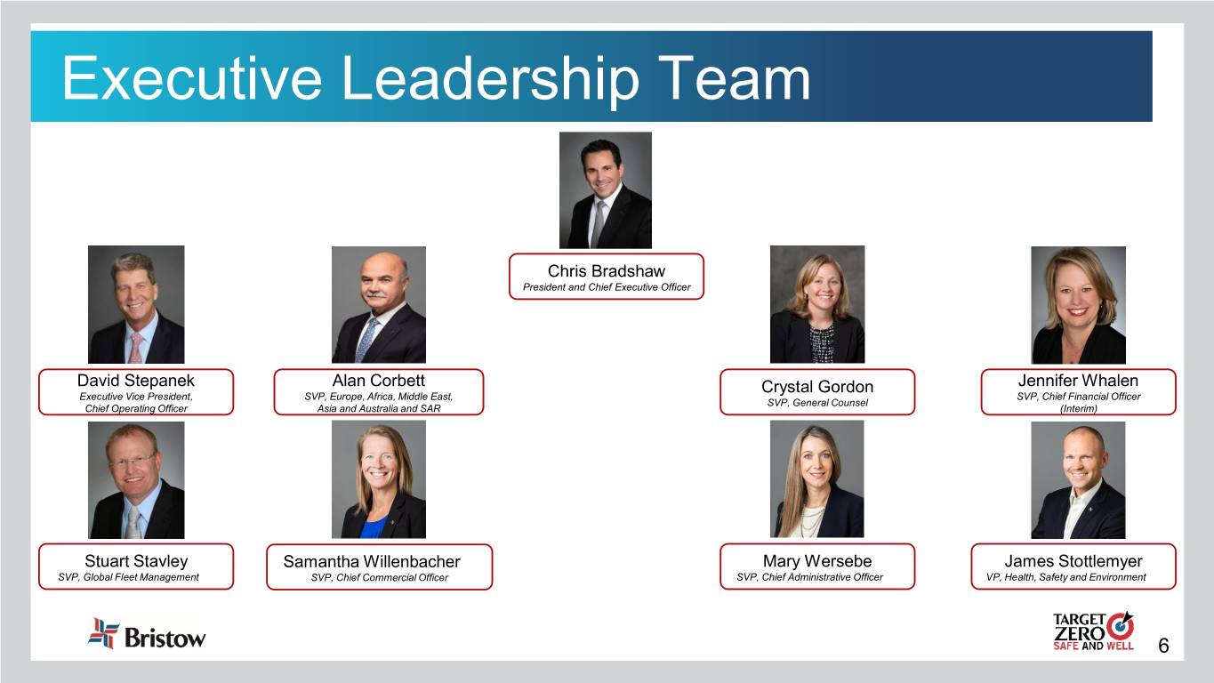 Transaction Update Transaction • The all-stock merger of Bristow Group Inc. and Era Group Inc. closed on June 11, 2020 • Combined company named Bristow Group Inc. Company Info • Headquartered in Houston, Texas • Publicly traded on the New York Stock Exchange (NYSE: VTOL) • CEO: Christopher S. Bradshaw Governance and • Board of Directors: G. Mark Mickelson (Chairman), Christopher S. Bradshaw, Lorin Brass, Leadership Charles Fabrikant, Wesley E. Kern, Robert J. Manzo, Christopher Pucillo, Brian D. Truelove • Combined annual revenue of ~$1.4bn Summary Financials • At least ~$35mm of expected annual cost synergies and Synergies • Strong balance sheet with significant liquidity and positive free cash flow generation • Manage the business for free cash flow Expected Financial • Focus on capital discipline Policies • Well-positioned to capitalize on additional strategic opportunities in select international markets 5