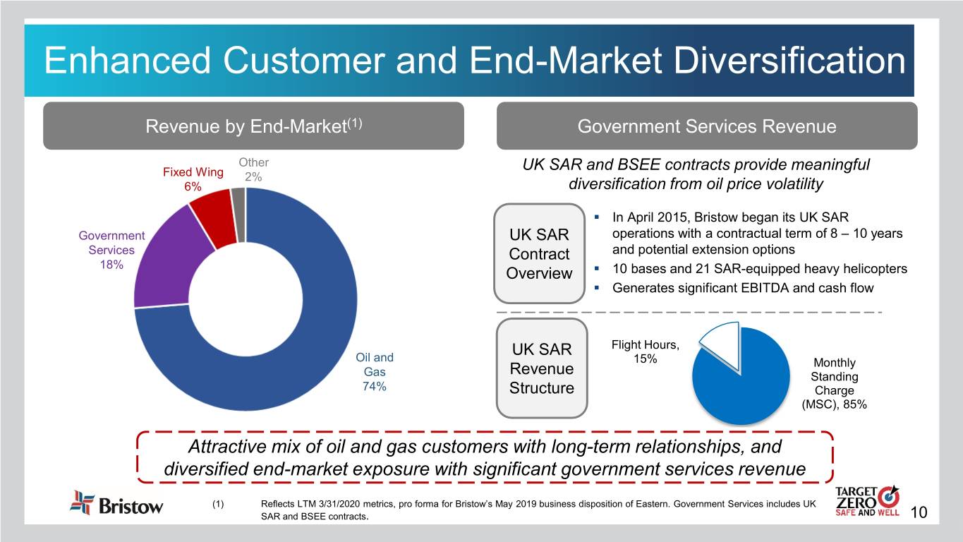 Global leader in offshore helicopter operations with significant presence in key regions, supplemented by stable government services revenue stream Global Presence(1) Attractive and Complementary Geographic Footprints LatAm and Caribbean Asia Pacific 5% 7% Africa 13% Europe 48% Trinidad North America 27% Significant presence in key offshore regions: U.S. Gulf of Mexico Norway United Kingdom Brazil Bristow Headquarters Legacy Era Headquarters Nigeria Trinidad, Guyana, Suriname Bristow Presence Legacy Era Operating Presence Era and Bristow Overlapping Legacy Era Dry Lease Presence (1) Reflects 3/31/2020 LTM revenue by geography 9
