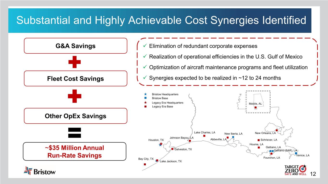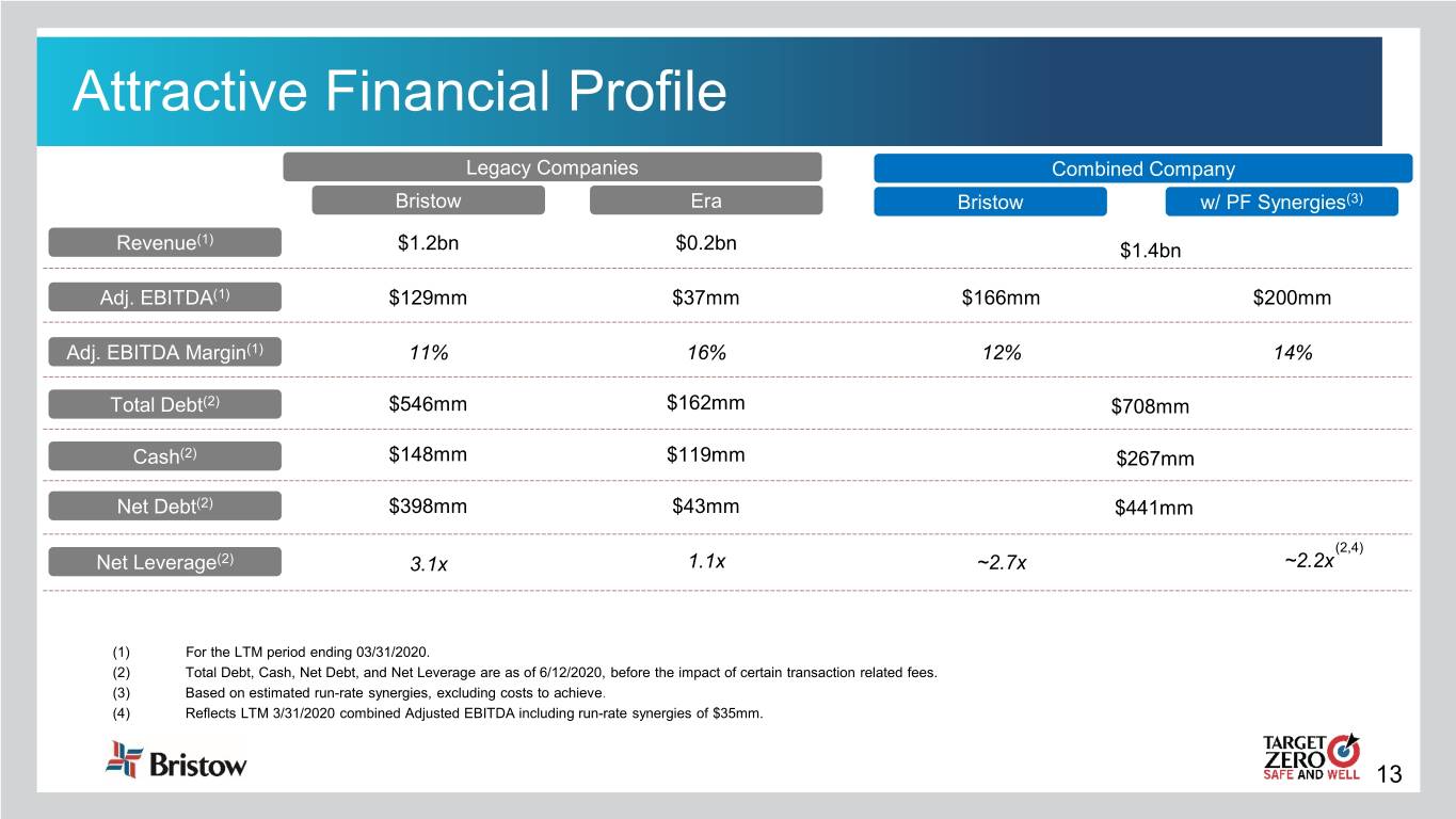 Substantial and Highly Achievable Cost Synergies Identified G&A Savings Elimination of redundant corporate expenses Realization of operational efficiencies in the U.S. Gulf of Mexico Optimization of aircraft maintenance programs and fleet utilization Fleet Cost Savings Synergies expected to be realized in ~12 to 24 months Bristow Headquarters Bristow Base Legacy Era Headquarters Mobile, AL Legacy Era Base Other OpEx Savings Lake Charles, LA New Iberia, LA New Orleans, LA Johnson Bayou, LA Houston, TX Abbeville, LA Schriever, LA Houma, LA Galliano, LA ~$35 Million Annual Galveston, TX Galliano (SAR), LA Venice, LA Run-Rate Savings Bay City, TX Fourchon, LA Lake Jackson, TX 12