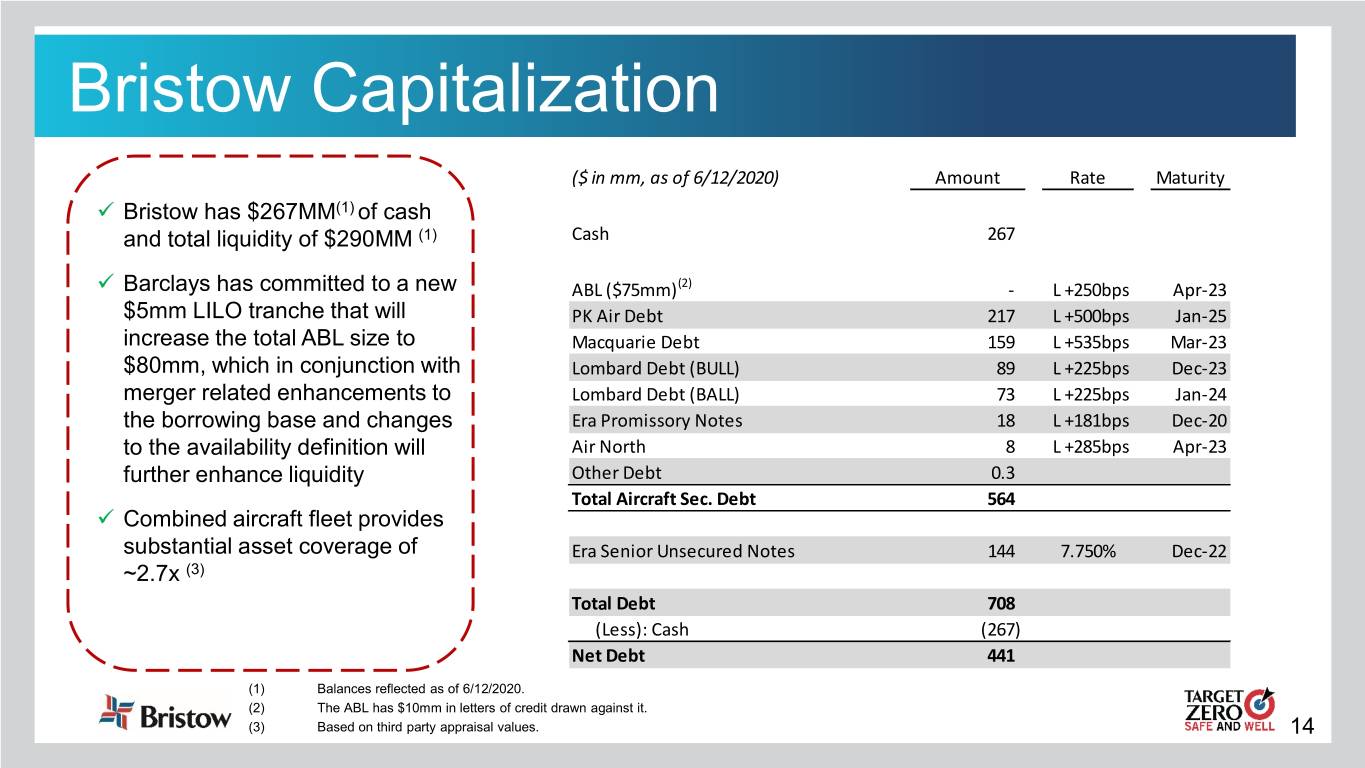 Attractive Financial Profile Legacy Companies Combined Company Bristow Era Bristow w/ PF Synergies(3) (1) Revenue $1.2bn $0.2bn $1.4bn Adj. EBITDA(1) $129mm $37mm $166mm $200mm Adj. EBITDA Margin(1) 11% 16% 12% 14% Total Debt(2) $546mm $162mm $708mm Cash(2) $148mm $119mm $267mm Net Debt(2) $398mm $43mm $441mm (2,4) Net Leverage(2) 3.1x 1.1x ~2.7x ~2.2x (1) For the LTM period ending 03/31/2020. (2) Total Debt, Cash, Net Debt, and Net Leverage are as of 6/12/2020, before the impact of certain transaction related fees. (3) Based on estimated run-rate synergies, excluding costs to achieve. (4) Reflects LTM 3/31/2020 combined Adjusted EBITDA including run-rate synergies of $35mm. 13