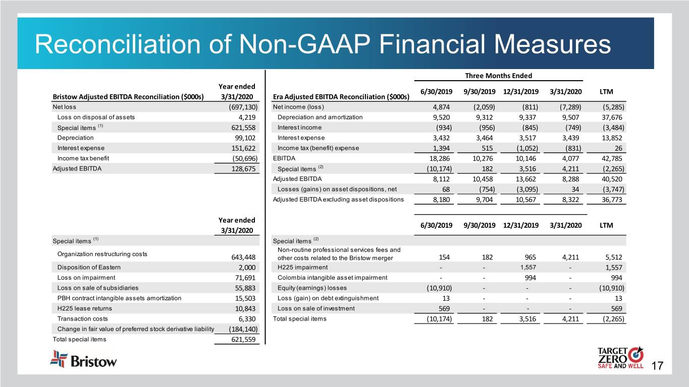 Reconciliation of Non-GAAP Financial Measures Three Months Ended Year ended 6/30/2019 9/30/2019 12/31/2019 3/31/2020 LTM Bristow Adjusted EBITDA Reconciliation ($000s) 3/31/2020 Era Adjusted EBITDA Reconciliation ($000s) Net loss (697,130) Net income (loss) 4,874 (2,059) (811) (7,289) (5,285) Loss on disposal of assets 4,219 Depreciation and amortization 9,520 9,312 9,337 9,507 37,676 Special items (1) 621,558 Interest income (934) (956) (845) (749) (3,484) Depreciation 99,102 Interest expense 3,432 3,464 3,517 3,439 13,852 Interest expense 151,622 Income tax (benefit) expense 1,394 515 (1,052) (831) 26 Income tax benefit (50,696) EBITDA 18,286 10,276 10,146 4,077 42,785 Adjusted EBITDA 128,675 Special items (2) (10,174) 182 3,516 4,211 (2,265) Adjusted EBITDA 8,112 10,458 13,662 8,288 40,520 Losses (gains) on asset dispositions, net 68 (754) (3,095) 34 (3,747) Adjusted EBITDA excluding asset dispositions 8,180 9,704 10,567 8,322 36,773 Year ended 6/30/2019 9/30/2019 12/31/2019 3/31/2020 LTM 3/31/2020 Special items (1) Special items (2) Non-routine professional services fees and Organization restructuring costs 643,448 other costs related to the Bristow merger 154 182 965 4,211 5,512 Disposition of Eastern 2,000 H225 impairment - - 1,557 - 1,557 Loss on impairment 71,691 Colombia intangible asset impairment - - 994 - 994 Loss on sale of subsidiaries 55,883 Equity (earnings) losses (10,910) - - - (10,910) PBH contract intangible assets amortization 15,503 Loss (gain) on debt extinguishment 13 - - - 13 H225 lease returns 10,843 Loss on sale of investment 569 - - - 569 Transaction costs 6,330 Total special items (10,174) 182 3,516 4,211 (2,265) Change in fair value of preferred stock derivative liability (184,140) Total special items 621,559 17