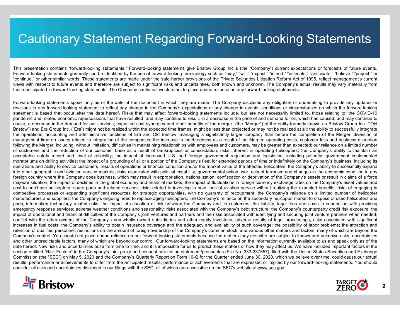 Cautionary Statement Regarding Forward-Looking Statements This presentation contains “forward-looking statements.” Forward-looking statements give Bristow Group Inc.’s (the “Company”) current expectations or forecasts of future events. Forward-looking statements generally can be identified by the use of forward-looking terminology such as “may,” “will,” “expect,” “intend,” “estimate,” “anticipate,” “believe,” “project,” or “continue,” or other similar words. These statements are made under the safe harbor provisions of the Private Securities Litigation Reform Act of 1995, reflect management’s current views with respect to future events and therefore are subject to significant risks and uncertainties, both known and unknown. The Company’s actual results may vary materially from those anticipated in forward-looking statements. The Company cautions investors not to place undue reliance on any forward-looking statements. Forward-looking statements speak only as of the date of the document in which they are made. The Company disclaims any obligation or undertaking to provide any updates or revisions to any forward-looking statement to reflect any change in the Company’s expectations or any change in events, conditions or circumstances on which the forward-looking statement is based that occur after the date hereof. Risks that may affect forward-looking statements include, but are not necessarily limited to, those relating to: the COVID-19 pandemic and related economic repercussions that have resulted, and may continue to result, in a decrease in the price of and demand for oil, which has caused, and may continue to cause, a decrease in the demand for our services; expected cost synergies and other benefits of the merger (the “Merger”) of the entity formerly known as Bristow Group Inc. (“Old Bristow”) and Era Group Inc. (“Era”) might not be realized within the expected time frames, might be less than projected or may not be realized at all; the ability to successfully integrate the operations, accounting and administrative functions of Era and Old Bristow; managing a significantly larger company than before the completion of the Merger; diversion of management time on issues related to integration of the companies; the increase in indebtedness as a result of the Merger; operating costs, customer loss and business disruption following the Merger, including, without limitation, difficulties in maintaining relationships with employees and customers, may be greater than expected; our reliance on a limited number of customers and the reduction of our customer base as a result of bankruptcies or consolidation; risks inherent in operating helicopters; the Company’s ability to maintain an acceptable safety record and level of reliability; the impact of increased U.S. and foreign government regulation and legislation, including potential government implemented moratoriums on drilling activities; the impact of a grounding of all or a portion of the Company’s fleet for extended periods of time or indefinitely on the Company’s business, including its operations and ability to service customers, results of operations or financial condition and/or the market value of the affected helicopters; the Company’s ability to successfully expand into other geographic and aviation service markets; risks associated with political instability, governmental action, war, acts of terrorism and changes in the economic condition in any foreign country where the Company does business, which may result in expropriation, nationalization, confiscation or deprivation of the Company’s assets or result in claims of a force majeure situation; the impact of declines in the global economy and financial markets; the impact of fluctuations in foreign currency exchange rates on the Company’s asset values and cost to purchase helicopters, spare parts and related services; risks related to investing in new lines of aviation service without realizing the expected benefits; risks of engaging in competitive processes or expending significant resources for strategic opportunities, with no guaranty of recoupment; the Company’s reliance on a limited number of helicopter manufacturers and suppliers; the Company’s ongoing need to replace aging helicopters; the Company’s reliance on the secondary helicopter market to dispose of used helicopters and parts; information technology related risks; the impact of allocation of risk between the Company and its customers; the liability, legal fees and costs in connection with providing emergency response services; adverse weather conditions and seasonality; risks associated with the Company’s debt structure; the Company’s counterparty credit risk exposure; the impact of operational and financial difficulties of the Company’s joint ventures and partners and the risks associated with identifying and securing joint venture partners when needed; conflict with the other owners of the Company’s non-wholly owned subsidiaries and other equity investees; adverse results of legal proceedings; risks associated with significant increases in fuel costs; the Company’s ability to obtain insurance coverage and the adequacy and availability of such coverage; the possibility of labor problems; the attraction and retention of qualified personnel; restrictions on the amount of foreign ownership of the Company’s common stock; and various other matters and factors, many of which are beyond the Company’s control. You should not place undue reliance on our forward-looking statements because the matters they describe are subject to known and unknown risks, uncertainties and other unpredictable factors, many of which are beyond our control. Our forward-looking statements are based on the information currently available to us and speak only as of the date hereof. New risks and uncertainties arise from time to time, and it is impossible fo