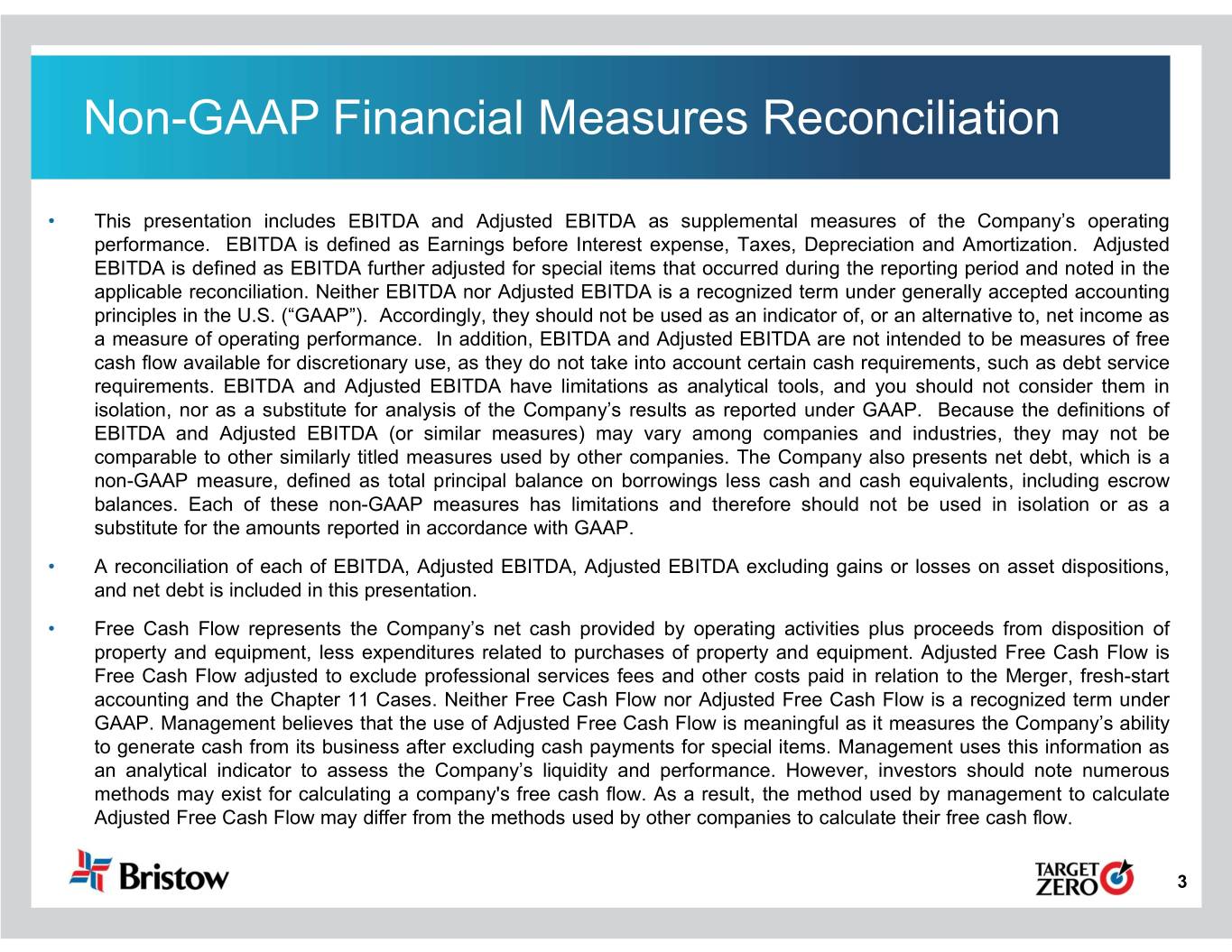Cautionary Statement Regarding Forward-Looking Statements This presentation contains “forward-looking statements.” Forward-looking statements give Bristow Group Inc.’s (the “Company”) current expectations or forecasts of future events. Forward-looking statements generally can be identified by the use of forward-looking terminology such as “may,” “will,” “expect,” “intend,” “estimate,” “anticipate,” “believe,” “project,” or “continue,” or other similar words. These statements are made under the safe harbor provisions of the Private Securities Litigation Reform Act of 1995, reflect management’s current views with respect to future events and therefore are subject to significant risks and uncertainties, both known and unknown. The Company’s actual results may vary materially from those anticipated in forward-looking statements. The Company cautions investors not to place undue reliance on any forward-looking statements. Forward-looking statements speak only as of the date of the document in which they are made. The Company disclaims any obligation or undertaking to provide any updates or revisions to any forward-looking statement to reflect any change in the Company’s expectations or any change in events, conditions or circumstances on which the forward-looking statement is based that occur after the date hereof. Risks that may affect forward-looking statements include, but are not necessarily limited to, those relating to: the COVID-19 pandemic and related economic repercussions that have resulted, and may continue to result, in a decrease in the price of and demand for oil, which has caused, and may continue to cause, a decrease in the demand for our services; expected cost synergies and other benefits of the merger (the “Merger”) of the entity formerly known as Bristow Group Inc. (“Old Bristow”) and Era Group Inc. (“Era”) might not be realized within the expected time frames, might be less than projected or may not be realized at all; the ability to successfully integrate the operations, accounting and administrative functions of Era and Old Bristow; managing a significantly larger company than before the completion of the Merger; diversion of management time on issues related to integration of the companies; the increase in indebtedness as a result of the Merger; operating costs, customer loss and business disruption following the Merger, including, without limitation, difficulties in maintaining relationships with employees and customers, may be greater than expected; our reliance on a limited number of customers and the reduction of our customer base as a result of bankruptcies or consolidation; risks inherent in operating helicopters; the Company’s ability to maintain an acceptable safety record and level of reliability; the impact of increased U.S. and foreign government regulation and legislation, including potential government implemented moratoriums on drilling activities; the impact of a grounding of all or a portion of the Company’s fleet for extended periods of time or indefinitely on the Company’s business, including its operations and ability to service customers, results of operations or financial condition and/or the market value of the affected helicopters; the Company’s ability to successfully expand into other geographic and aviation service markets; risks associated with political instability, governmental action, war, acts of terrorism and changes in the economic condition in any foreign country where the Company does business, which may result in expropriation, nationalization, confiscation or deprivation of the Company’s assets or result in claims of a force majeure situation; the impact of declines in the global economy and financial markets; the impact of fluctuations in foreign currency exchange rates on the Company’s asset values and cost to purchase helicopters, spare parts and related services; risks related to investing in new lines of aviation service without realizing the expected benefits; risks of engaging in competitive processes or expending significant resources for strategic opportunities, with no guaranty of recoupment; the Company’s reliance on a limited number of helicopter manufacturers and suppliers; the Company’s ongoing need to replace aging helicopters; the Company’s reliance on the secondary helicopter market to dispose of used helicopters and parts; information technology related risks; the impact of allocation of risk between the Company and its customers; the liability, legal fees and costs in connection with providing emergency response services; adverse weather conditions and seasonality; risks associated with the Company’s debt structure; the Company’s counterparty credit risk exposure; the impact of operational and financial difficulties of the Company’s joint ventures and partners and the risks associated with identifying and securing joint venture partners when needed; conflict with the other owners of the Company’s non-wholly owned subsidiaries and other equity investees; adverse results of legal proceedings; risks associated with significant increases in fuel costs; the Company’s ability to obtain insurance coverage and the adequacy and availability of such coverage; the possibility of labor problems; the attraction and retention of qualified personnel; restrictions on the amount of foreign ownership of the Company’s common stock; and various other matters and factors, many of which are beyond the Company’s control. You should not place undue reliance on our forward-looking statements because the matters they describe are subject to known and unknown risks, uncertainties and other unpredictable factors, many of which are beyond our control. Our forward-looking statements are based on the information currently available to us and speak only as of the date hereof. New risks and uncertainties arise from time to time, and it is impossible fo