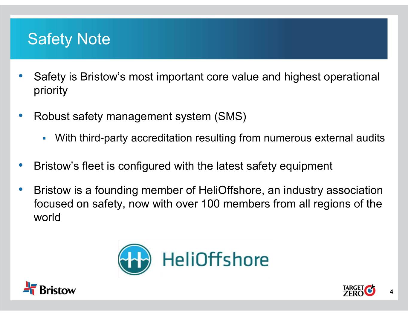 Cautionary Statement Regarding Forward-Looking Statements This presentation contains “forward-looking statements.” Forward-looking statements give Bristow Group Inc.’s (the “Company”) current expectations or forecasts of future events. Forward-looking statements generally can be identified by the use of forward-looking terminology such as “may,” “will,” “expect,” “intend,” “estimate,” “anticipate,” “believe,” “project,” or “continue,” or other similar words. These statements are made under the safe harbor provisions of the Private Securities Litigation Reform Act of 1995, reflect management’s current views with respect to future events and therefore are subject to significant risks and uncertainties, both known and unknown. The Company’s actual results may vary materially from those anticipated in forward-looking statements. The Company cautions investors not to place undue reliance on any forward-looking statements. Forward-looking statements speak only as of the date of the document in which they are made. The Company disclaims any obligation or undertaking to provide any updates or revisions to any forward-looking statement to reflect any change in the Company’s expectations or any change in events, conditions or circumstances on which the forward-looking statement is based that occur after the date hereof. Risks that may affect forward-looking statements include, but are not necessarily limited to, those relating to: the COVID-19 pandemic and related economic repercussions that have resulted, and may continue to result, in a decrease in the price of and demand for oil, which has caused, and may continue to cause, a decrease in the demand for our services; expected cost synergies and other benefits of the merger (the “Merger”) of the entity formerly known as Bristow Group Inc. (“Old Bristow”) and Era Group Inc. (“Era”) might not be realized within the expected time frames, might be less than projected or may not be realized at all; the ability to successfully integrate the operations, accounting and administrative functions of Era and Old Bristow; managing a significantly larger company than before the completion of the Merger; diversion of management time on issues related to integration of the companies; the increase in indebtedness as a result of the Merger; operating costs, customer loss and business disruption following the Merger, including, without limitation, difficulties in maintaining relationships with employees and customers, may be greater than expected; our reliance on a limited number of customers and the reduction of our customer base as a result of bankruptcies or consolidation; risks inherent in operating helicopters; the Company’s ability to maintain an acceptable safety record and level of reliability; the impact of increased U.S. and foreign government regulation and legislation, including potential government implemented moratoriums on drilling activities; the impact of a grounding of all or a portion of the Company’s fleet for extended periods of time or indefinitely on the Company’s business, including its operations and ability to service customers, results of operations or financial condition and/or the market value of the affected helicopters; the Company’s ability to successfully expand into other geographic and aviation service markets; risks associated with political instability, governmental action, war, acts of terrorism and changes in the economic condition in any foreign country where the Company does business, which may result in expropriation, nationalization, confiscation or deprivation of the Company’s assets or result in claims of a force majeure situation; the impact of declines in the global economy and financial markets; the impact of fluctuations in foreign currency exchange rates on the Company’s asset values and cost to purchase helicopters, spare parts and related services; risks related to investing in new lines of aviation service without realizing the expected benefits; risks of engaging in competitive processes or expending significant resources for strategic opportunities, with no guaranty of recoupment; the Company’s reliance on a limited number of helicopter manufacturers and suppliers; the Company’s ongoing need to replace aging helicopters; the Company’s reliance on the secondary helicopter market to dispose of used helicopters and parts; information technology related risks; the impact of allocation of risk between the Company and its customers; the liability, legal fees and costs in connection with providing emergency response services; adverse weather conditions and seasonality; risks associated with the Company’s debt structure; the Company’s counterparty credit risk exposure; the impact of operational and financial difficulties of the Company’s joint ventures and partners and the risks associated with identifying and securing joint venture partners when needed; conflict with the other owners of the Company’s non-wholly owned subsidiaries and other equity investees; adverse results of legal proceedings; risks associated with significant increases in fuel costs; the Company’s ability to obtain insurance coverage and the adequacy and availability of such coverage; the possibility of labor problems; the attraction and retention of qualified personnel; restrictions on the amount of foreign ownership of the Company’s common stock; and various other matters and factors, many of which are beyond the Company’s control. You should not place undue reliance on our forward-looking statements because the matters they describe are subject to known and unknown risks, uncertainties and other unpredictable factors, many of which are beyond our control. Our forward-looking statements are based on the information currently available to us and speak only as of the date hereof. New risks and uncertainties arise from time to time, and it is impossible fo