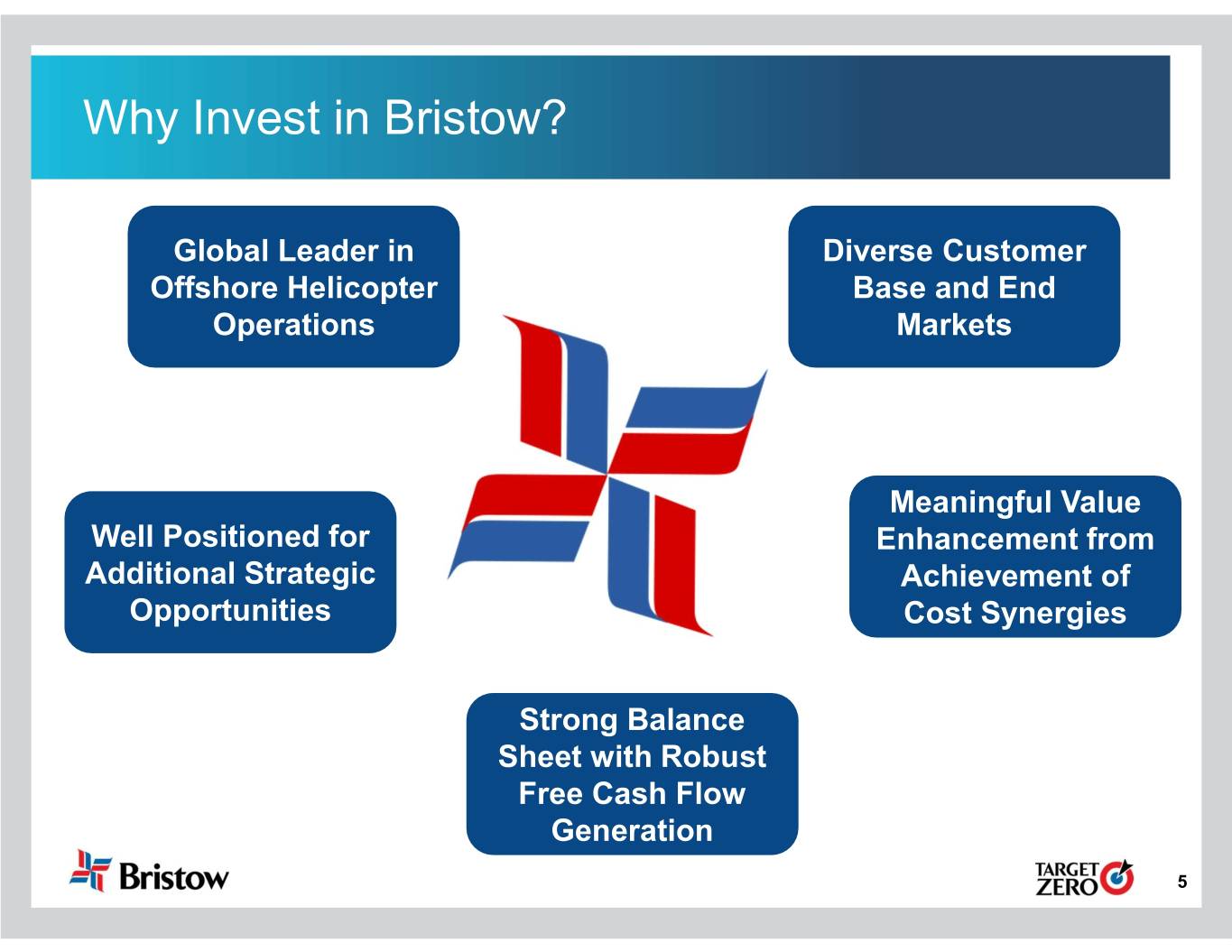 Safety Note • Safety is Bristow’s most important core value and highest operational priority • Robust safety management system (SMS) . With third-party accreditation resulting from numerous external audits • Bristow’s fleet is configured with the latest safety equipment • Bristow is a founding member of HeliOffshore, an industry association focused on safety, now with over 100 members from all regions of the world 4