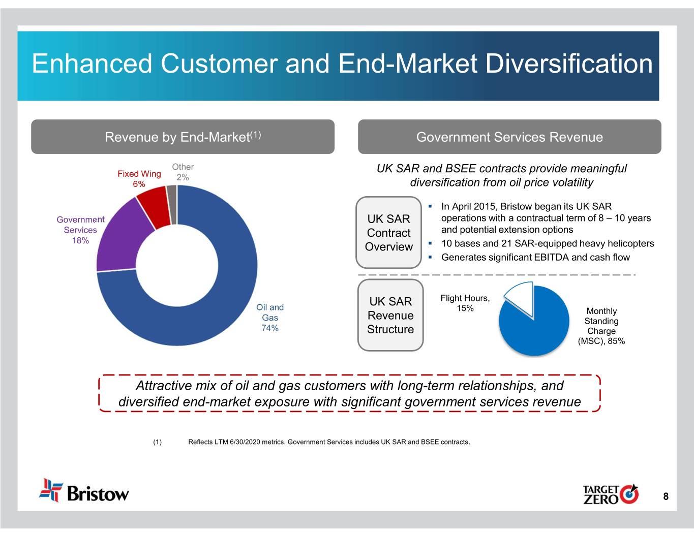 Global leader in offshore helicopter operations with significant presence in key regions, supplemented by stable government services revenue stream Global Presence(1) Attractive Geographic Footprint Asia Pacific 6% Africa 12% Americas Europe 33% 49% Trinidad Significant presence in key offshore regions: U.S. Gulf of Mexico Norway United Kingdom Brazil Nigeria Bristow Headquarters Operating Presence Dry Lease Trinidad, Guyana, Suriname (1) Reflects pro forma 6/30/2020 LTM revenue 7