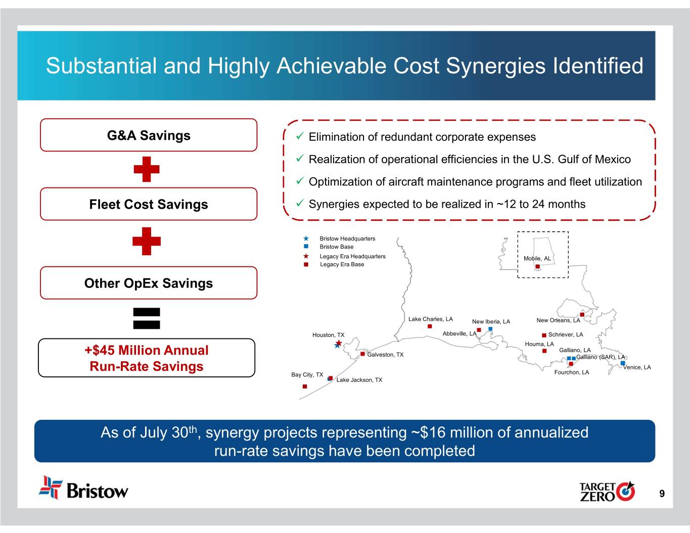 Substantial and Highly Achievable Cost Synergies Identified Substantial and Highly Achievable Cost Synergies Identified G&A Savings Elimination of redundant corporate expenses Realization of operational efficiencies in the U.S. Gulf of Mexico Optimization of aircraft maintenance programs and fleet utilization Fleet Cost Savings Synergies expected to be realized in ~12 to 24 months Bristow Headquarters Bristow Base Legacy Era Headquarters Mobile, AL Legacy Era Base Other OpEx Savings Lake Charles, LA New Iberia, LA New Orleans, LA Houston, TX Abbeville, LA Schriever, LA Houma, LA Galliano, LA +$45 Million Annual Galveston, TX Galliano (SAR), LA Run-Rate Savings Venice, LA Bay City, TX Fourchon, LA Lake Jackson, TX As of July 30th, synergy projects representing ~$16 million of annualized run-rate savings have been completed 9