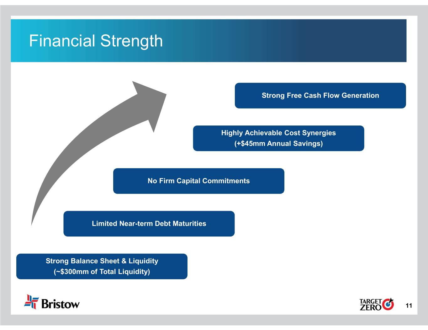 Strong Balance Sheet and Financial Flexibility • Total available liquidity as of June 30, 2020 was approximately $300 million . $260 million in unrestricted cash balances . $39 million of remaining availability under the Company’s ABL facility • Net debt of $440 million as of June 30, 2020 • Bristow generated $26 million of adjusted free cash flow in the three months ended June 30, 2020 • All of the Company's unfunded capital commitments may be canceled without further liability other than forfeiture of previously paid deposits of $2 million Pro Forma Annual Run-Rate LTM Adj. EBITDA(1) Synergies $172mm +$45mm (1) See page 16 for reconciliation of LTM Adjusted EBITDA excluding Asset Dispositions. Includes de minimis synergies for 19-day period post-merger 10