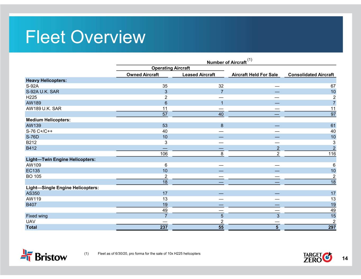 Cautionary Statement Regarding Forward-Looking Statements This presentation contains “forward-looking statements.” Forward-looking statements give Bristow Group Inc.’s (the “Company”) current expectations or forecasts of future events. Forward-looking statements generally can be identified by the use of forward-looking terminology such as “may,” “will,” “expect,” “intend,” “estimate,” “anticipate,” “believe,” “project,” or “continue,” or other similar words. These statements are made under the safe harbor provisions of the Private Securities Litigation Reform Act of 1995, reflect management’s current views with respect to future events and therefore are subject to significant risks and uncertainties, both known and unknown. The Company’s actual results may vary materially from those anticipated in forward-looking statements. The Company cautions investors not to place undue reliance on any forward-looking statements. Forward-looking statements speak only as of the date of the document in which they are made. The Company disclaims any obligation or undertaking to provide any updates or revisions to any forward-looking statement to reflect any change in the Company’s expectations or any change in events, conditions or circumstances on which the forward-looking statement is based that occur after the date hereof. Risks that may affect forward-looking statements include, but are not necessarily limited to, those relating to: the COVID-19 pandemic and related economic repercussions that have resulted, and may continue to result, in a decrease in the price of and demand for oil, which has caused, and may continue to cause, a decrease in the demand for our services; expected cost synergies and other benefits of the merger (the “Merger”) of the entity formerly known as Bristow Group Inc. (“Old Bristow”) and Era Group Inc. (“Era”) might not be realized within the expected time frames, might be less than projected or may not be realized at all; the ability to successfully integrate the operations, accounting and administrative functions of Era and Old Bristow; managing a significantly larger company than before the completion of the Merger; diversion of management time on issues related to integration of the companies; the increase in indebtedness as a result of the Merger; operating costs, customer loss and business disruption following the Merger, including, without limitation, difficulties in maintaining relationships with employees and customers, may be greater than expected; our reliance on a limited number of customers and the reduction of our customer base as a result of bankruptcies or consolidation; risks inherent in operating helicopters; the Company’s ability to maintain an acceptable safety record and level of reliability; the impact of increased U.S. and foreign government regulation and legislation, including potential government implemented moratoriums on drilling activities; the impact of a grounding of all or a portion of the Company’s fleet for extended periods of time or indefinitely on the Company’s business, including its operations and ability to service customers, results of operations or financial condition and/or the market value of the affected helicopters; the Company’s ability to successfully expand into other geographic and aviation service markets; risks associated with political instability, governmental action, war, acts of terrorism and changes in the economic condition in any foreign country where the Company does business, which may result in expropriation, nationalization, confiscation or deprivation of the Company’s assets or result in claims of a force majeure situation; the impact of declines in the global economy and financial markets; the impact of fluctuations in foreign currency exchange rates on the Company’s asset values and cost to purchase helicopters, spare parts and related services; risks related to investing in new lines of aviation service without realizing the expected benefits; risks of engaging in competitive processes or expending significant resources for strategic opportunities, with no guaranty of recoupment; the Company’s reliance on a limited number of helicopter manufacturers and suppliers; the Company’s ongoing need to replace aging helicopters; the Company’s reliance on the secondary helicopter market to dispose of used helicopters and parts; information technology related risks; the impact of allocation of risk between the Company and its customers; the liability, legal fees and costs in connection with providing emergency response services; adverse weather conditions and seasonality; risks associated with the Company’s debt structure; the Company’s counterparty credit risk exposure; the impact of operational and financial difficulties of the Company’s joint ventures and partners and the risks associated with identifying and securing joint venture partners when needed; conflict with the other owners of the Company’s non-wholly owned subsidiaries and other equity investees; adverse results of legal proceedings; risks associated with significant increases in fuel costs; the Company’s ability to obtain insurance coverage and the adequacy and availability of such coverage; the possibility of labor problems; the attraction and retention of qualified personnel; restrictions on the amount of foreign ownership of the Company’s common stock; and various other matters and factors, many of which are beyond the Company’s control. You should not place undue reliance on our forward-looking statements because the matters they describe are subject to known and unknown risks, uncertainties and other unpredictable factors, many of which are beyond our control. Our forward-looking statements are based on the information currently available to us and speak only as of the date hereof. New risks and uncertainties arise from time to time, and it is impossible fo