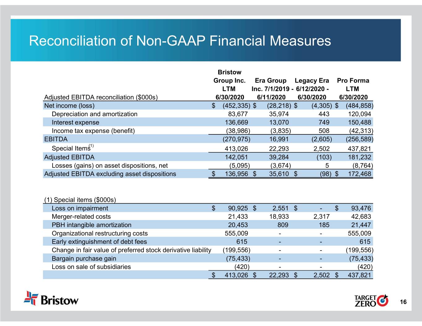 Reconciliation of Non-GAAP Financial Measures Bristow Group Inc. Era Group Legacy Era Pro Forma LTM Inc. 7/1/2019 - 6/12/2020 - LTM Adjusted EBITDA reconciliation ($000s) 6/30/2020 6/11/2020 6/30/2020 6/30/2020 Net income (loss)$ (452,335) $ (28,218) $ (4,305) $ (484,858) Depreciation and amortization 83,677 35,974 443 120,094 Interest expense 136,669 13,070 749 150,488 Income tax expense (benefit) (38,986) (3,835) 508 (42,313) EBITDA (270,975) 16,991 (2,605) (256,589) (1) Special Items 413,026 22,293 2,502 437,821 Adjusted EBITDA 142,051 39,284 (103) 181,232 Losses (gains) on asset dispositions, net (5,095) (3,674) 5 (8,764) Adjusted EBITDA excluding asset dispositions$ 136,956 $ 35,610 $ (98) $ 172,468 (1) Special items ($000s) Loss on impairment$ 90,925 $ 2,551 $ - $ 93,476 Merger-related costs 21,433 18,933 2,317 42,683 PBH intangible amortization 20,453 809 185 21,447 Organizational restructuring costs 555,009 - - 555,009 Early extinguishment of debt fees 615 - - 615 Change in fair value of preferred stock derivative liability (199,556) - - (199,556) Bargain purchase gain (75,433) - - (75,433) Loss on sale of subsidiaries (420) - - (420) $ 413,026 $ 22,293 $ 2,502 $ 437,821 16