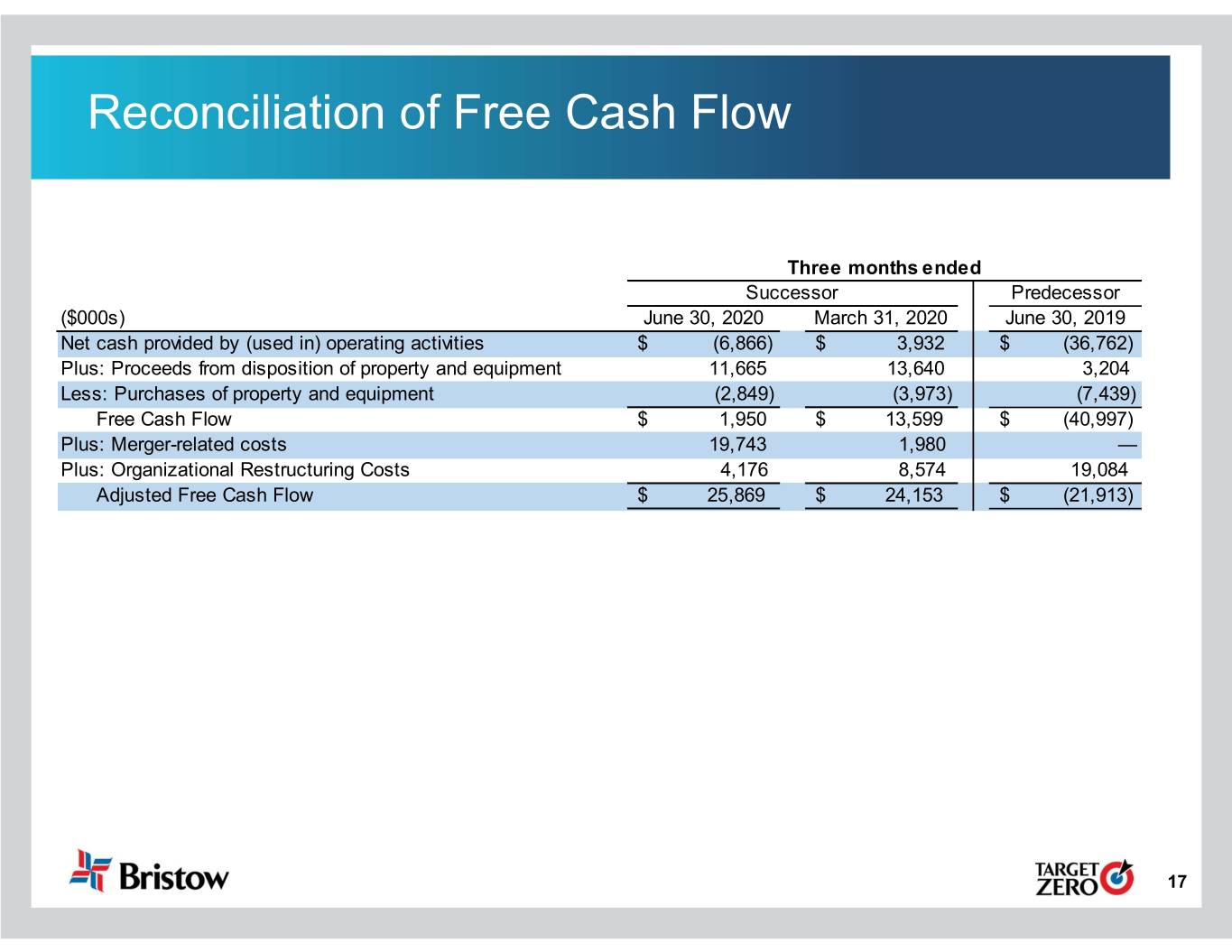 Reconciliation of Free Cash Flow Three months ended Successor Predecessor ($000s) June 30, 2020 March 31, 2020 June 30, 2019 Net cash provided by (used in) operating activities $ (6,866) $ 3,932 $ (36,762) Plus: Proceeds from disposition of property and equipment 11,665 13,640 3,204 Less: Purchases of property and equipment (2,849) (3,973) (7,439) Free Cash Flow $ 1,950 $ 13,599 $ (40,997) Plus: Merger-related costs 19,743 1,980 — Plus: Organizational Restructuring Costs 4,176 8,574 19,084 Adjusted Free Cash Flow $ 25,869 $ 24,153 $ (21,913) 17