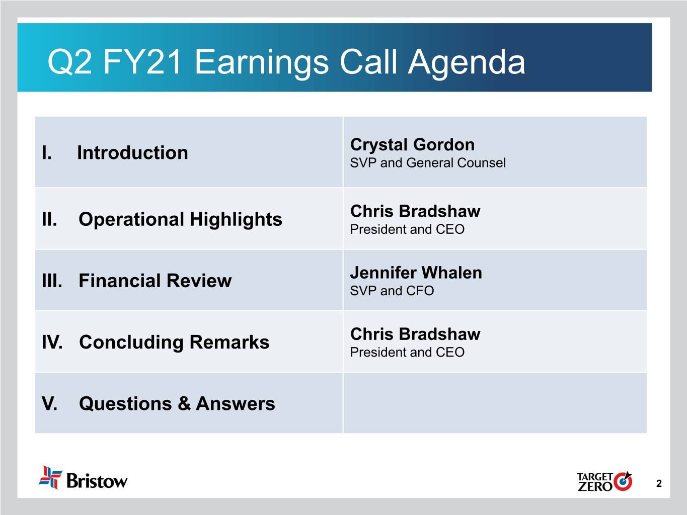 Cautionary Statement Regarding Forward-Looking Statements This presentation contains “forward-looking statements.” Forward-looking statements represent Bristow Group Inc.’s (the “Company”) current expectations or forecasts of future events. Forward-looking statements generally can be identified by the use of forward-looking terminology such as “may,” “will,” “expect,” “intend,” “estimate,” “anticipate,” “believe,” “project,” or “continue,” or other similar words. These statements are made under the safe harbor provisions of the Private Securities Litigation Reform Act of 1995, reflect management’s current views with respect to future events and therefore are subject to significant risks and uncertainties, both known and unknown. The Company’s actual results may vary materially from those anticipated in forward-looking statements. The Company cautions investors not to place undue reliance on any forward-looking statements. Forward-looking statements speak only as of the date of the document in which they are made. The Company disclaims any obligation or undertaking to provide any updates or revisions to any forward-looking statement to reflect any change in the Company’s expectations or any change in events, conditions or circumstances on which the forward-looking statement is based that occur after the date hereof. Risks that may affect forward-looking statements include, but are not necessarily limited to, those relating to: the COVID-19 pandemic and related economic repercussions have resulted, and may continue to result, in a decrease in the price of and demand for oil, which has caused, and may continue to cause, a decrease in the demand for our services; expected cost synergies and other benefits of the merger (the “Merger”) of the entity formerly known as Bristow Group Inc. (“Old Bristow”) and Era Group Inc. (“Era”) might not be realized within the expected time frames, might be less than projected or may not be realized at all; the ability to successfully integrate the operations, accounting and administrative functions of Era and Old Bristow; managing a significantly larger company than before the completion of the Merger; diversion of management time on issues related to integration of the companies; the increase in indebtedness as a result of the Merger; operating costs, customer loss and business disruption following the Merger, including, without limitation, difficulties in maintaining relationships with employees and customers, may be greater than expected; our reliance on a limited number of customers and the reduction of our customer base as a result of bankruptcies or consolidation; risks inherent in operating helicopters; the Company’s ability to maintain an acceptable safety record and level of reliability; the impact of increased U.S. and foreign government regulation and legislation, including potential government implemented moratoriums on drilling activities; the impact of a grounding of all or a portion of the Company’s fleet for extended periods of time or indefinitely on the Company’s business, including its operations and ability to service customers, results of operations or financial condition and/or the market value of the affected helicopters; the Company’s ability to successfully expand into other geographic and aviation service markets; risks associated with political instability, governmental action, war, acts of terrorism and changes in the economic condition in any foreign country where the Company does business, which may result in expropriation, nationalization, confiscation or deprivation of the Company’s assets or result in claims of a force majeure situation; the impact of declines in the global economy and financial markets; the impact of fluctuations in foreign currency exchange rates on the Company’s asset values and cost to purchase helicopters, spare parts and related services; risks related to investing in new lines of aviation service without realizing the expected benefits; risks of engaging in competitive processes or expending significant resources for strategic opportunities, with no guaranty of recoupment; the Company’s reliance on a limited number of helicopter manufacturers and suppliers; the Company’s ongoing need to replace aging helicopters; the Company’s reliance on the secondary helicopter market to dispose of used helicopters and parts; information technology related risks; the impact of allocation of risk between the Company and its customers; the liability, legal fees and costs in connection with providing emergency response services; adverse weather conditions and seasonality; risks associated with the Company’s debt structure; the Company’s counterparty credit risk exposure; the impact of operational and financial difficulties of the Company’s joint ventures and partners and the risks associated with identifying and securing joint venture partners when needed; conflict with the other owners of the Company’s non-wholly owned subsidiaries and other equity investees; adverse results of legal proceedings; risks associated with significant increases in fuel costs; the Company’s ability to obtain insurance coverage and the adequacy and availability of such coverage; the possibility of labor problems; the attraction and retention of qualified personnel; restrictions on the amount of foreign ownership of the Company’s common stock; and various other matters and factors, many of which are beyond the Company’s control. You should not place undue reliance on our forward-looking statements because the matters they describe are subject to known and unknown risks, uncertainties and other unpredictable factors, many of which are beyond our control. Our forward-looking statements are based on the information currently available to us and speak only as of the date hereof. New risks and uncertainties arise from time to time, and it is impossible fo