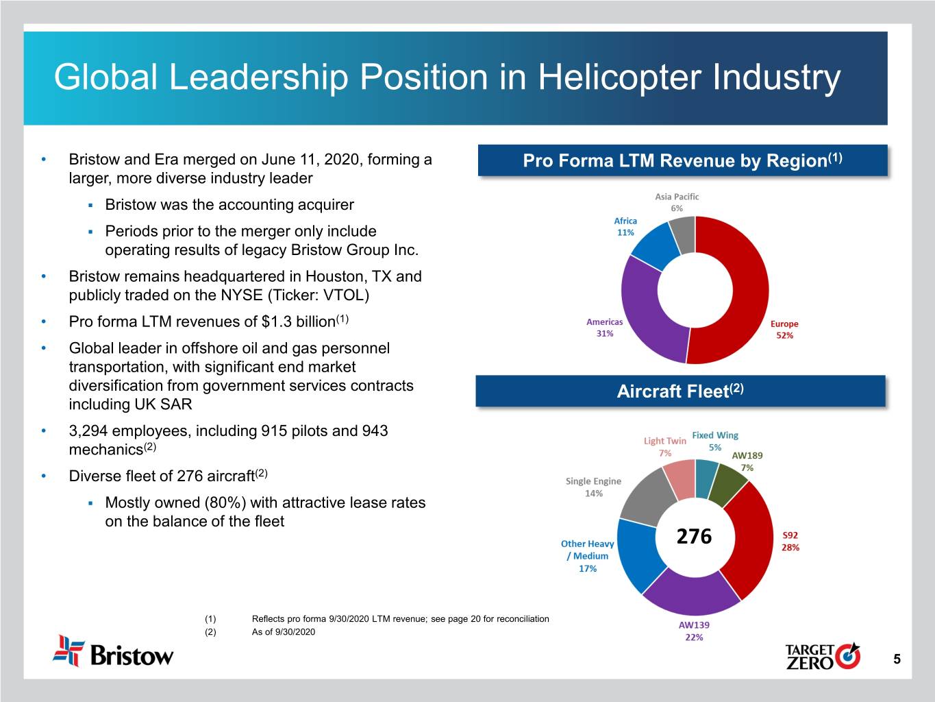 Non-GAAP and Pro Forma Financial Measures Non-GAAP In addition to financial results calculated in accordance with U.S. generally accepted accounting principles (“GAAP”), this presentation includes certain non-GAAP measures including EBITDA, Adjusted EBITDA, Net Debt, Free Cash Flow and Adjusted Free Cash Flow. EBITDA and Adjusted EBITDA are presented as supplemental measures of the Company’s operating performance. EBITDA is defined as Earnings before Interest expense, Taxes, Depreciation and Amortization. Adjusted EBITDA is defined as EBITDA further adjusted for special items that occurred during the reporting period and noted in the applicable reconciliation. Since neither EBITDA nor Adjusted EBITDA is a recognized term under GAAP, they should not be used as an indicator of, or an alternative to, net income as a measure of operating performance. In addition, EBITDA and Adjusted EBITDA are not intended to be measures of free cash flow available for discretionary use, as they do not take into account certain cash requirements, such as debt service requirements. Because the definitions of EBITDA and Adjusted EBITDA (or similar measures) may vary among companies and industries, they may not be comparable to other similarly titled measures used by other companies. Free Cash Flow represents the Company’s net cash provided by operating activities plus proceeds from disposition of property and equipment, less expenditures related to purchases of property and equipment. Adjusted Free Cash Flow is Free Cash Flow adjusted to exclude professional services fees and other costs paid in relation to the Merger, the implementation of fresh-start accounting and the voluntary petitions filed by Old Bristow and certain of its subsidiaries on May 11, 2019 in the U.S. Bankruptcy Court for the Southern District of Texas, Houston Division seeking relief under Chapter 11 of Title 11 of the U.S. Code (the “Chapter 11 Cases”). Management believes that the use of Adjusted Free Cash Flow is meaningful as it measures the Company’s ability to generate cash from its business after excluding cash payments for special items. Management uses this information as an analytical indicator to assess the Company’s liquidity and performance. However, investors should note numerous methods may exist for calculating a company's free cash flow. As a result, the method used by management to calculate Adjusted Free Cash Flow may differ from the methods used by other companies to calculate their free cash flow. The Company also presents net debt, which is a non-GAAP measure, defined as total principal balance on borrowings less cash and cash equivalents, including escrow balances. Each of these non-GAAP measures has limitations and therefore should not be used in isolation or as a substitute for the amounts reported in accordance with GAAP. A reconciliation of each of EBITDA, Adjusted EBITDA, Adjusted EBITDA excluding gains or losses on asset dispositions, Free Cash Flow, Adjusted Free Cash Flow. and net debt is included elsewhere in this presentation. Pro Forma This presentation also includes certain financial information provided on a “pro forma” basis to reflect the consummation of the Merger and certain related transactions. The results of operations data was prepared assuming the Merger and related transactions occurred at the beginning of the applicable period. The balance sheet data only gives pro forma effect to the Merger and related transactions and was prepared assuming those transactions occurred on September 30, 2020. Pro forma financial information included in this presentation has been prepared in accordance with guidance set forth in Article 11 of Regulation S-X. As a result, we do not believe our pro forma information are non-GAAP financial measures. Pro forma financial information does not necessarily reflect the actual results that we would have achieved had the pro forma transactions been consummated on the date or dates indicated nor does it reflect our potential future results. 4