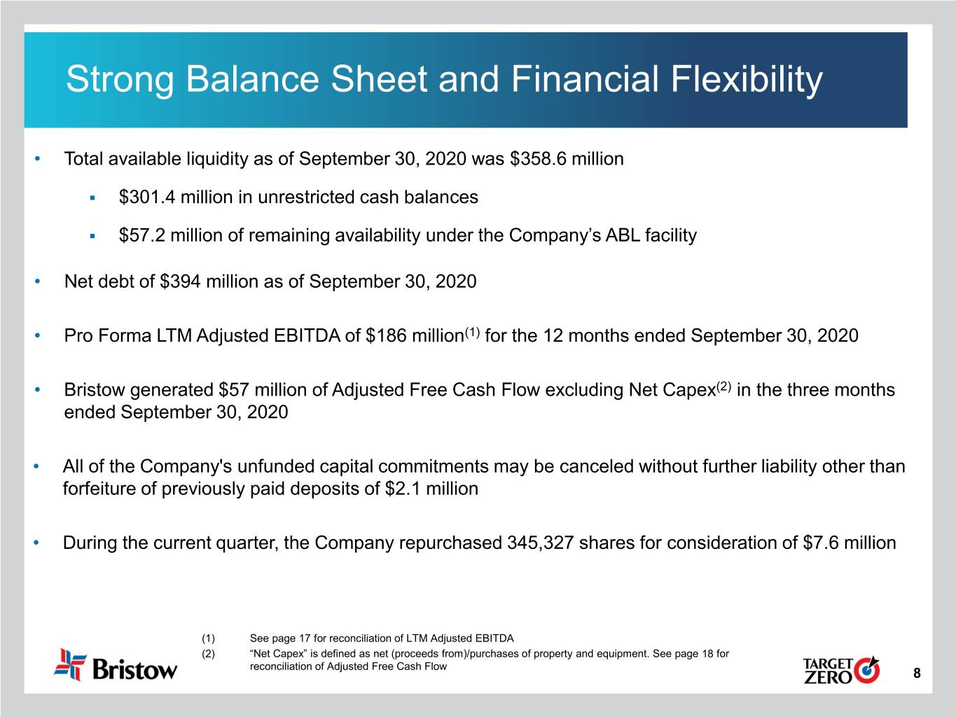 Cautionary Statement Regarding Forward-Looking Statements This presentation contains “forward-looking statements.” Forward-looking statements represent Bristow Group Inc.’s (the “Company”) current expectations or forecasts of future events. Forward-looking statements generally can be identified by the use of forward-looking terminology such as “may,” “will,” “expect,” “intend,” “estimate,” “anticipate,” “believe,” “project,” or “continue,” or other similar words. These statements are made under the safe harbor provisions of the Private Securities Litigation Reform Act of 1995, reflect management’s current views with respect to future events and therefore are subject to significant risks and uncertainties, both known and unknown. The Company’s actual results may vary materially from those anticipated in forward-looking statements. The Company cautions investors not to place undue reliance on any forward-looking statements. Forward-looking statements speak only as of the date of the document in which they are made. The Company disclaims any obligation or undertaking to provide any updates or revisions to any forward-looking statement to reflect any change in the Company’s expectations or any change in events, conditions or circumstances on which the forward-looking statement is based that occur after the date hereof. Risks that may affect forward-looking statements include, but are not necessarily limited to, those relating to: the COVID-19 pandemic and related economic repercussions have resulted, and may continue to result, in a decrease in the price of and demand for oil, which has caused, and may continue to cause, a decrease in the demand for our services; expected cost synergies and other benefits of the merger (the “Merger”) of the entity formerly known as Bristow Group Inc. (“Old Bristow”) and Era Group Inc. (“Era”) might not be realized within the expected time frames, might be less than projected or may not be realized at all; the ability to successfully integrate the operations, accounting and administrative functions of Era and Old Bristow; managing a significantly larger company than before the completion of the Merger; diversion of management time on issues related to integration of the companies; the increase in indebtedness as a result of the Merger; operating costs, customer loss and business disruption following the Merger, including, without limitation, difficulties in maintaining relationships with employees and customers, may be greater than expected; our reliance on a limited number of customers and the reduction of our customer base as a result of bankruptcies or consolidation; risks inherent in operating helicopters; the Company’s ability to maintain an acceptable safety record and level of reliability; the impact of increased U.S. and foreign government regulation and legislation, including potential government implemented moratoriums on drilling activities; the impact of a grounding of all or a portion of the Company’s fleet for extended periods of time or indefinitely on the Company’s business, including its operations and ability to service customers, results of operations or financial condition and/or the market value of the affected helicopters; the Company’s ability to successfully expand into other geographic and aviation service markets; risks associated with political instability, governmental action, war, acts of terrorism and changes in the economic condition in any foreign country where the Company does business, which may result in expropriation, nationalization, confiscation or deprivation of the Company’s assets or result in claims of a force majeure situation; the impact of declines in the global economy and financial markets; the impact of fluctuations in foreign currency exchange rates on the Company’s asset values and cost to purchase helicopters, spare parts and related services; risks related to investing in new lines of aviation service without realizing the expected benefits; risks of engaging in competitive processes or expending significant resources for strategic opportunities, with no guaranty of recoupment; the Company’s reliance on a limited number of helicopter manufacturers and suppliers; the Company’s ongoing need to replace aging helicopters; the Company’s reliance on the secondary helicopter market to dispose of used helicopters and parts; information technology related risks; the impact of allocation of risk between the Company and its customers; the liability, legal fees and costs in connection with providing emergency response services; adverse weather conditions and seasonality; risks associated with the Company’s debt structure; the Company’s counterparty credit risk exposure; the impact of operational and financial difficulties of the Company’s joint ventures and partners and the risks associated with identifying and securing joint venture partners when needed; conflict with the other owners of the Company’s non-wholly owned subsidiaries and other equity investees; adverse results of legal proceedings; risks associated with significant increases in fuel costs; the Company’s ability to obtain insurance coverage and the adequacy and availability of such coverage; the possibility of labor problems; the attraction and retention of qualified personnel; restrictions on the amount of foreign ownership of the Company’s common stock; and various other matters and factors, many of which are beyond the Company’s control. You should not place undue reliance on our forward-looking statements because the matters they describe are subject to known and unknown risks, uncertainties and other unpredictable factors, many of which are beyond our control. Our forward-looking statements are based on the information currently available to us and speak only as of the date hereof. New risks and uncertainties arise from time to time, and it is impossible fo