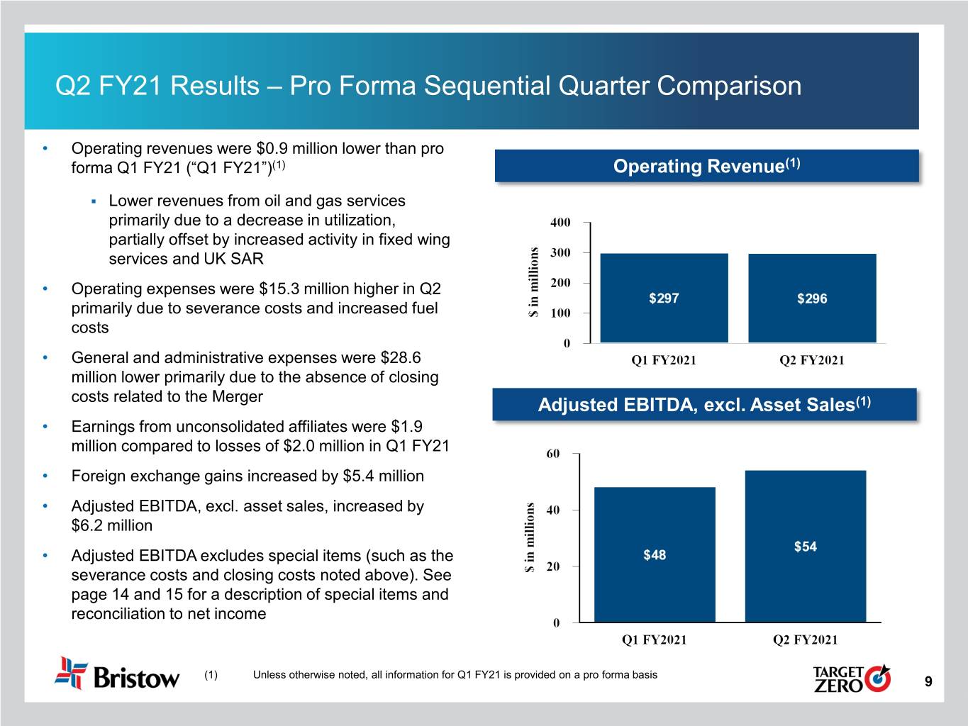 Cautionary Statement Regarding Forward-Looking Statements This presentation contains “forward-looking statements.” Forward-looking statements represent Bristow Group Inc.’s (the “Company”) current expectations or forecasts of future events. Forward-looking statements generally can be identified by the use of forward-looking terminology such as “may,” “will,” “expect,” “intend,” “estimate,” “anticipate,” “believe,” “project,” or “continue,” or other similar words. These statements are made under the safe harbor provisions of the Private Securities Litigation Reform Act of 1995, reflect management’s current views with respect to future events and therefore are subject to significant risks and uncertainties, both known and unknown. The Company’s actual results may vary materially from those anticipated in forward-looking statements. The Company cautions investors not to place undue reliance on any forward-looking statements. Forward-looking statements speak only as of the date of the document in which they are made. The Company disclaims any obligation or undertaking to provide any updates or revisions to any forward-looking statement to reflect any change in the Company’s expectations or any change in events, conditions or circumstances on which the forward-looking statement is based that occur after the date hereof. Risks that may affect forward-looking statements include, but are not necessarily limited to, those relating to: the COVID-19 pandemic and related economic repercussions have resulted, and may continue to result, in a decrease in the price of and demand for oil, which has caused, and may continue to cause, a decrease in the demand for our services; expected cost synergies and other benefits of the merger (the “Merger”) of the entity formerly known as Bristow Group Inc. (“Old Bristow”) and Era Group Inc. (“Era”) might not be realized within the expected time frames, might be less than projected or may not be realized at all; the ability to successfully integrate the operations, accounting and administrative functions of Era and Old Bristow; managing a significantly larger company than before the completion of the Merger; diversion of management time on issues related to integration of the companies; the increase in indebtedness as a result of the Merger; operating costs, customer loss and business disruption following the Merger, including, without limitation, difficulties in maintaining relationships with employees and customers, may be greater than expected; our reliance on a limited number of customers and the reduction of our customer base as a result of bankruptcies or consolidation; risks inherent in operating helicopters; the Company’s ability to maintain an acceptable safety record and level of reliability; the impact of increased U.S. and foreign government regulation and legislation, including potential government implemented moratoriums on drilling activities; the impact of a grounding of all or a portion of the Company’s fleet for extended periods of time or indefinitely on the Company’s business, including its operations and ability to service customers, results of operations or financial condition and/or the market value of the affected helicopters; the Company’s ability to successfully expand into other geographic and aviation service markets; risks associated with political instability, governmental action, war, acts of terrorism and changes in the economic condition in any foreign country where the Company does business, which may result in expropriation, nationalization, confiscation or deprivation of the Company’s assets or result in claims of a force majeure situation; the impact of declines in the global economy and financial markets; the impact of fluctuations in foreign currency exchange rates on the Company’s asset values and cost to purchase helicopters, spare parts and related services; risks related to investing in new lines of aviation service without realizing the expected benefits; risks of engaging in competitive processes or expending significant resources for strategic opportunities, with no guaranty of recoupment; the Company’s reliance on a limited number of helicopter manufacturers and suppliers; the Company’s ongoing need to replace aging helicopters; the Company’s reliance on the secondary helicopter market to dispose of used helicopters and parts; information technology related risks; the impact of allocation of risk between the Company and its customers; the liability, legal fees and costs in connection with providing emergency response services; adverse weather conditions and seasonality; risks associated with the Company’s debt structure; the Company’s counterparty credit risk exposure; the impact of operational and financial difficulties of the Company’s joint ventures and partners and the risks associated with identifying and securing joint venture partners when needed; conflict with the other owners of the Company’s non-wholly owned subsidiaries and other equity investees; adverse results of legal proceedings; risks associated with significant increases in fuel costs; the Company’s ability to obtain insurance coverage and the adequacy and availability of such coverage; the possibility of labor problems; the attraction and retention of qualified personnel; restrictions on the amount of foreign ownership of the Company’s common stock; and various other matters and factors, many of which are beyond the Company’s control. You should not place undue reliance on our forward-looking statements because the matters they describe are subject to known and unknown risks, uncertainties and other unpredictable factors, many of which are beyond our control. Our forward-looking statements are based on the information currently available to us and speak only as of the date hereof. New risks and uncertainties arise from time to time, and it is impossible fo