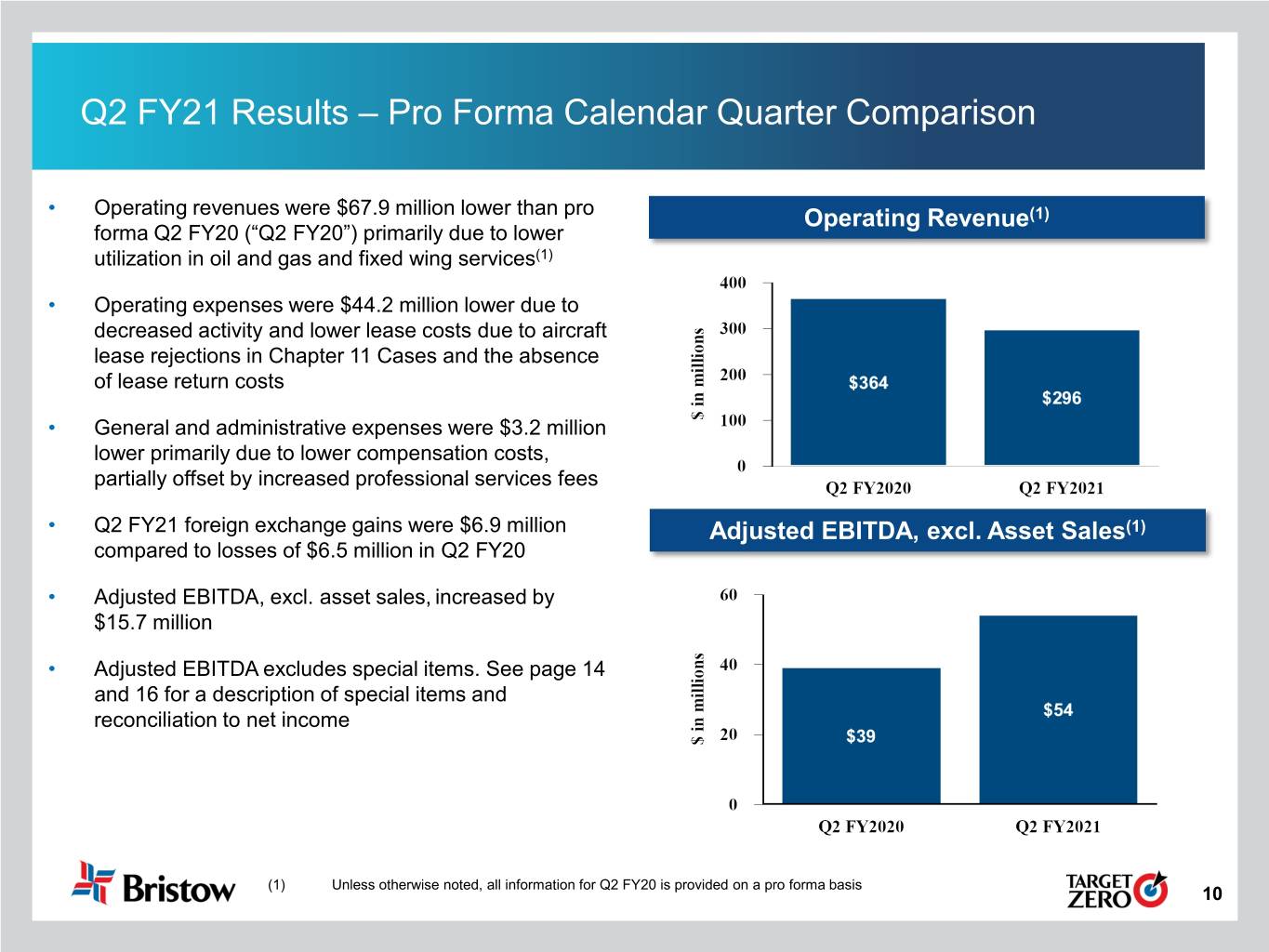 Q2 FY21 Results – Pro Forma Sequential Quarter Comparison • Operating revenues were $0.9 million lower than pro forma Q1 FY21 (“Q1 FY21”)(1) Operating Revenue(1) . Lower revenues from oil and gas services primarily due to a decrease in utilization, partially offset by increased activity in fixed wing services and UK SAR • Operating expenses were $15.3 million higher in Q2 primarily due to severance costs and increased fuel costs • General and administrative expenses were $28.6 million lower primarily due to the absence of closing costs related to the Merger Adjusted EBITDA, excl. Asset Sales(1) • Earnings from unconsolidated affiliates were $1.9 million compared to losses of $2.0 million in Q1 FY21 • Foreign exchange gains increased by $5.4 million • Adjusted EBITDA, excl. asset sales, increased by $6.2 million • Adjusted EBITDA excludes special items (such as the severance costs and closing costs noted above). See page 14 and 15 for a description of special items and reconciliation to net income (1) Unless otherwise noted, all information for Q1 FY21 is provided on a pro forma basis 9