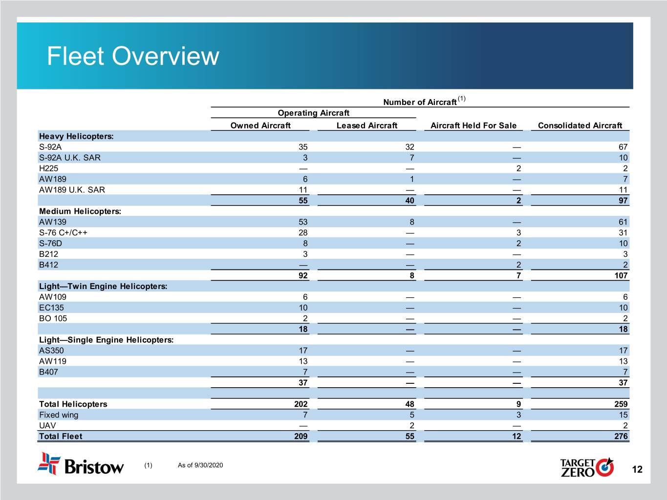 Fleet Overview (1) Number of Aircraft Operating Aircraft Owned Aircraft Leased Aircraft Aircraft Held For Sale Consolidated Aircraft Heavy Helicopters: S-92A 35 32 — 67 S-92A U.K. SAR 3 7 — 10 H225 — — 2 2 AW189 6 1 — 7 AW189 U.K. SAR 11 — — 11 55 40 2 97 Medium Helicopters: AW139 53 8 — 61 S-76 C+/C++ 28 — 3 31 S-76D 8 — 2 10 B212 3 — — 3 B412 — — 2 2 92 8 7 107 Light—Twin Engine Helicopters: AW109 6 — — 6 EC135 10 — — 10 BO 105 2 — — 2 18 — — 18 Light—Single Engine Helicopters: AS350 17 — — 17 AW119 13 — — 13 B407 7 — — 7 37 — — 37 Total Helicopters 202 48 9 259 Fixed wing 7 5 3 15 UAV — 2 — 2 Total Fleet 209 55 12 276 (1) As of 9/30/2020 12
