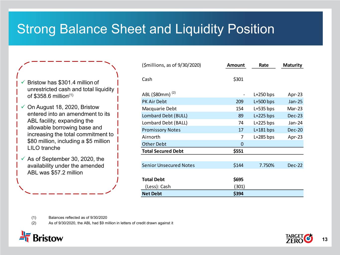 Strong Balance Sheet and Financial Flexibility • Total available liquidity as of September 30, 2020 was $358.6 million . $301.4 million in unrestricted cash balances . $57.2 million of remaining availability under the Company’s ABL facility • Net debt of $394 million as of September 30, 2020 • Pro Forma LTM Adjusted EBITDA of $186 million(1) for the 12 months ended September 30, 2020 • Bristow generated $57 million of Adjusted Free Cash Flow excluding Net Capex(2) in the three months ended September 30, 2020 • All of the Company's unfunded capital commitments may be canceled without further liability other than forfeiture of previously paid deposits of $2.1 million • During the current quarter, the Company repurchased 345,327 shares for consideration of $7.6 million (1) See page 17 for reconciliation of LTM Adjusted EBITDA (2) “Net Capex” is defined as net (proceeds from)/purchases of property and equipment. See page 18 for reconciliation of Adjusted Free Cash Flow 8