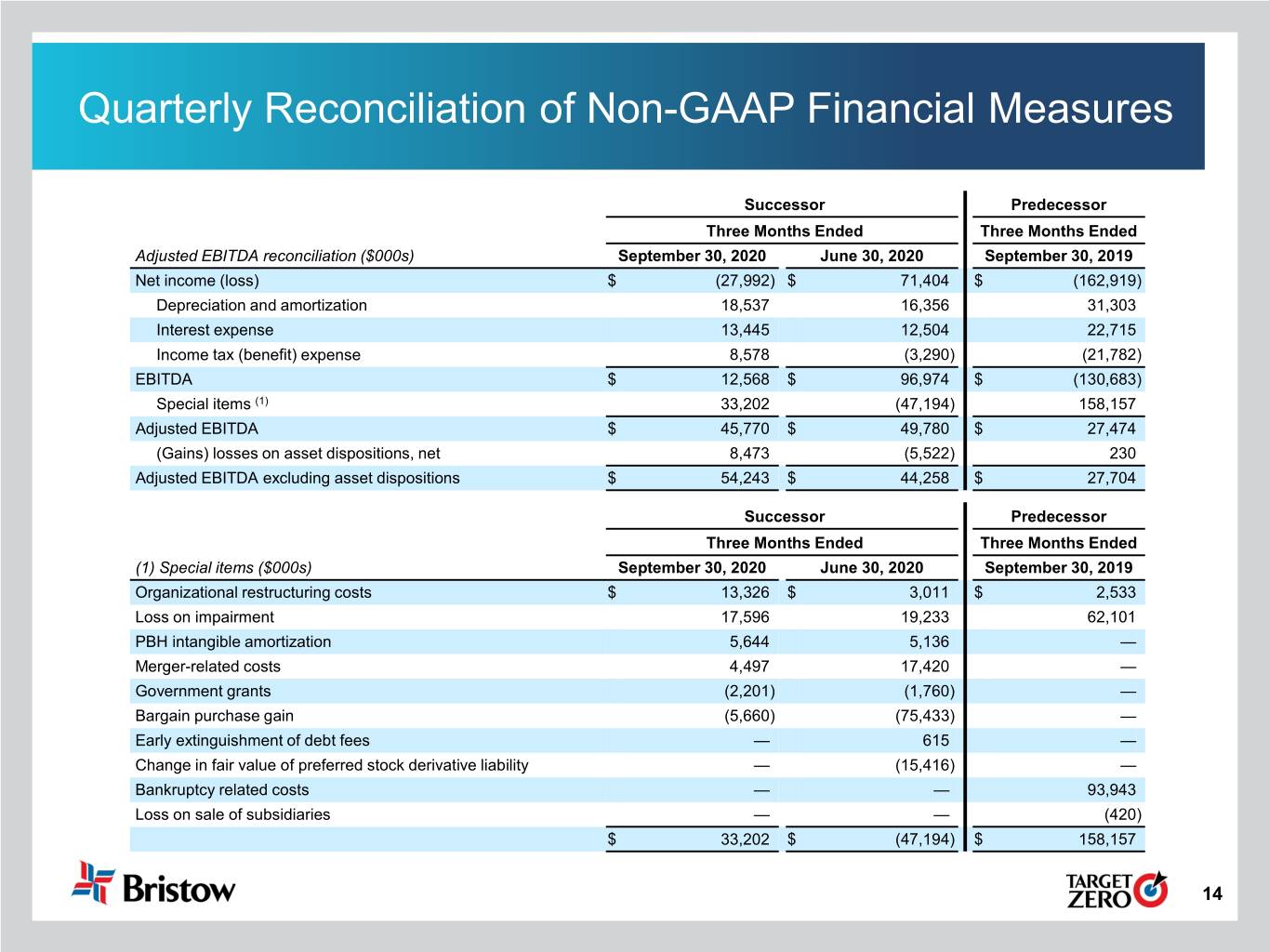 Reconciliation of Pro Forma LTM Adjusted EBITDA Era Group Bristow Old Bristow Inc. Legacy Era Group Inc. Pro Forma October 1, October 1, QTD LTM 2019 - June 2019 - June June 12 - 30, September September 30, 30, 2020 11, 2020 2020 30, 2020 2020 Net income (loss) $ (289,416) $ (26,159) $ (4,305) $ (27,992) $ (347,872) Depreciation and amortization 52,374 26,662 443 18,537 98,016 Interest expense 113,954 9,606 749 13,445 137,754 Income tax (benefit) expense (17,204) (4,350) 508 8,578 (12,468) EBITDA $ (140,292) $ 5,759 $ (2,605) $ 12,568 $ (124,570) Special items (1) 253,109 21,898 2,502 33,202 310,711 Adjusted EBITDA $ 112,817 $ 27,657 $ (103) $ 45,770 $ 186,141 (Gains) losses on asset dispositions, net (5,325) (2,920) 5 8,473 233 Adjusted EBITDA excluding asset dispositions $ 107,492 $ 24,737 $ (98) $ 54,243 $ 186,374 (1) Special items include the following: Era Group Bristow Old Bristow Inc. Legacy Era Group Inc. Pro Forma October 1, October 1, QTD LTM 2019 - June 2019 - June June 12 - 30, September September 30, 30, 2020 11, 2020 2020 30, 2020 2020 Bankruptcy related costs $ 454,906 $ — $ — $ — $ 454,906 Loss on impairments 28,824 2,369 — 17,596 48,789 Merger-related costs 21,433 18,933 2,317 4,497 47,180 PBH intangible amortization 20,453 596 185 5,644 26,878 Organizational restructuring costs 3,627 — — 13,326 16,953 Early extinguishment of debt fees 615 — — — 615 Government grants (1,760) — — (2,201) (3,961) Bargain purchase gain (75,433) — — (5,660) (81,093) Change in fair value of preferred stock derivative liability (199,556) — — — (199,556) $ 253,109 $ 21,898 $ 2,502 $ 33,202 $ 310,711 17