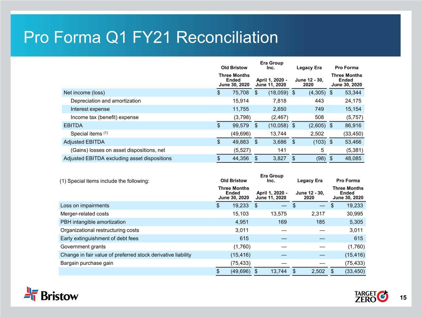 Pro Forma Q1 FY21 Reconciliation Era Group Old Bristow Inc. Legacy Era Pro Forma Three Months Three Months Ended April 1, 2020 - June 12 - 30, Ended June 30, 2020 June 11, 2020 2020 June 30, 2020 Net income (loss) $ 75,708 $ (18,059) $ (4,305) $ 53,344 Depreciation and amortization 15,914 7,818 443 24,175 Interest expense 11,755 2,650 749 15,154 Income tax (benefit) expense (3,798) (2,467) 508 (5,757) EBITDA $ 99,579 $ (10,058) $ (2,605) $ 86,916 Special items (1) (49,696) 13,744 2,502 (33,450) Adjusted EBITDA $ 49,883 $ 3,686 $ (103) $ 53,466 (Gains) losses on asset dispositions, net (5,527) 141 5 (5,381) Adjusted EBITDA excluding asset dispositions $ 44,356 $ 3,827 $ (98) $ 48,085 Era Group (1) Special items include the following: Old Bristow Inc. Legacy Era Pro Forma Three Months Three Months Ended April 1, 2020 - June 12 - 30, Ended June 30, 2020 June 11, 2020 2020 June 30, 2020 Loss on impairments $ 19,233 $ — $ — $ 19,233 Merger-related costs 15,103 13,575 2,317 30,995 PBH intangible amortization 4,951 169 185 5,305 Organizational restructuring costs 3,011 — — 3,011 Early extinguishment of debt fees 615 — — 615 Government grants (1,760) — — (1,760) Change in fair value of preferred stock derivative liability (15,416) — — (15,416) Bargain purchase gain (75,433) — — (75,433) $ (49,696) $ 13,744 $ 2,502 $ (33,450) 15