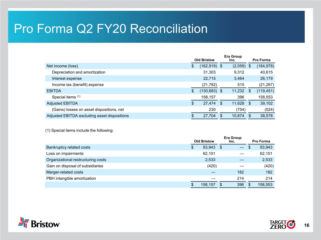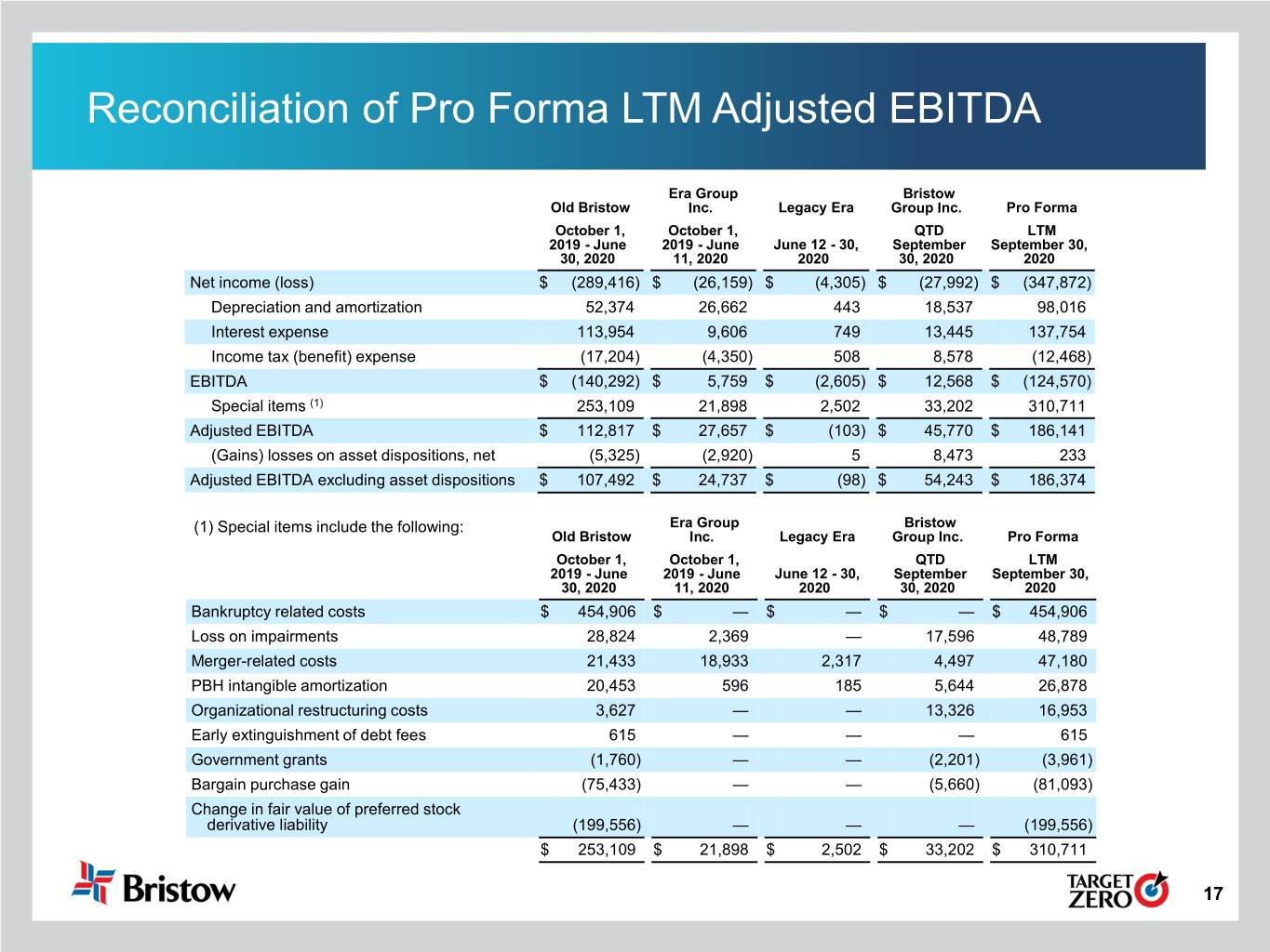 Pro Forma Q2 FY20 Reconciliation Era Group Old Bristow Inc. Pro Forma Net income (loss) $ (162,919) $ (2,059) $ (164,978) Depreciation and amortization 31,303 9,312 40,615 Interest expense 22,715 3,464 26,179 Income tax (benefit) expense (21,782) 515 (21,267) EBITDA $ (130,683) $ 11,232 $ (119,451) Special items (1) 158,157 396 158,553 Adjusted EBITDA $ 27,474 $ 11,628 $ 39,102 (Gains) losses on asset dispositions, net 230 (754) (524) Adjusted EBITDA excluding asset dispositions $ 27,704 $ 10,874 $ 38,578 (1) Special items include the following: Era Group Old Bristow Inc. Pro Forma Bankruptcy related costs $ 93,943 $ — $ 93,943 Loss on impairments 62,101 — 62,101 Organizational restructuring costs 2,533 — 2,533 Gain on disposal of subsidiaries (420) — (420) Merger-related costs — 182 182 PBH intangible amortization — 214 214 $ 158,157 $ 396 $ 158,553 16