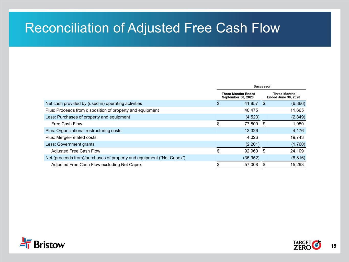 Reconciliation of Adjusted Free Cash Flow Successor Three Months Ended Three Months September 30, 2020 Ended June 30, 2020 Net cash provided by (used in) operating activities $ 41,857 $ (6,866) Plus: Proceeds from disposition of property and equipment 40,475 11,665 Less: Purchases of property and equipment (4,523) (2,849) Free Cash Flow $ 77,809 $ 1,950 Plus: Organizational restructuring costs 13,326 4,176 Plus: Merger-related costs 4,026 19,743 Less: Government grants (2,201) (1,760) Adjusted Free Cash Flow $ 92,960 $ 24,109 Net (proceeds from)/purchases of property and equipment (“Net Capex”) (35,952) (8,816) Adjusted Free Cash Flow excluding Net Capex $ 57,008 $ 15,293 18