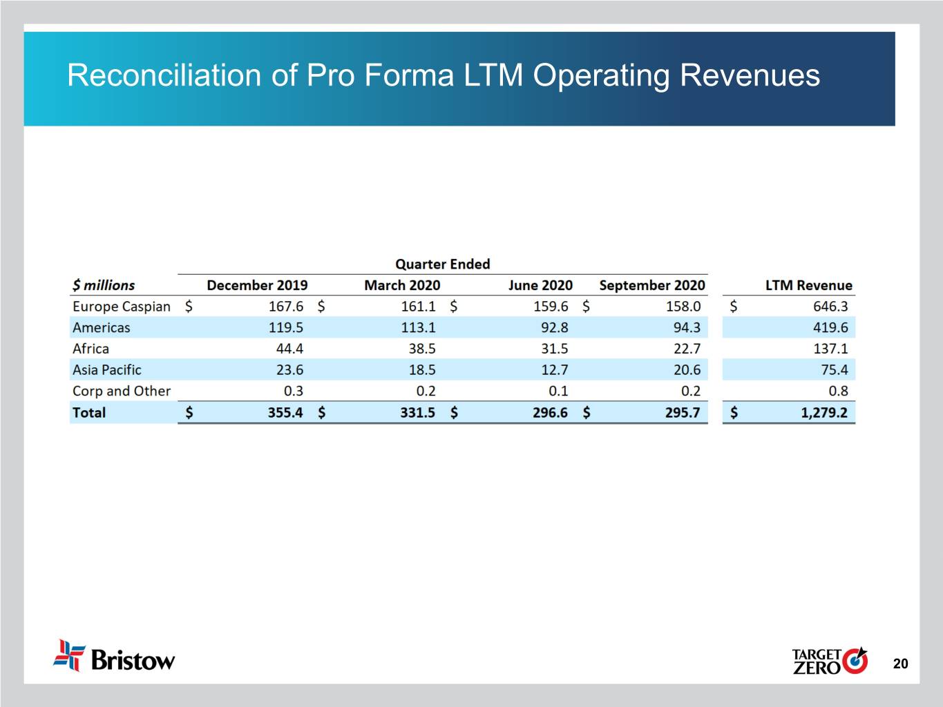 Cautionary Statement Regarding Forward-Looking Statements This presentation contains “forward-looking statements.” Forward-looking statements represent Bristow Group Inc.’s (the “Company”) current expectations or forecasts of future events. Forward-looking statements generally can be identified by the use of forward-looking terminology such as “may,” “will,” “expect,” “intend,” “estimate,” “anticipate,” “believe,” “project,” or “continue,” or other similar words. These statements are made under the safe harbor provisions of the Private Securities Litigation Reform Act of 1995, reflect management’s current views with respect to future events and therefore are subject to significant risks and uncertainties, both known and unknown. The Company’s actual results may vary materially from those anticipated in forward-looking statements. The Company cautions investors not to place undue reliance on any forward-looking statements. Forward-looking statements speak only as of the date of the document in which they are made. The Company disclaims any obligation or undertaking to provide any updates or revisions to any forward-looking statement to reflect any change in the Company’s expectations or any change in events, conditions or circumstances on which the forward-looking statement is based that occur after the date hereof. Risks that may affect forward-looking statements include, but are not necessarily limited to, those relating to: the COVID-19 pandemic and related economic repercussions have resulted, and may continue to result, in a decrease in the price of and demand for oil, which has caused, and may continue to cause, a decrease in the demand for our services; expected cost synergies and other benefits of the merger (the “Merger”) of the entity formerly known as Bristow Group Inc. (“Old Bristow”) and Era Group Inc. (“Era”) might not be realized within the expected time frames, might be less than projected or may not be realized at all; the ability to successfully integrate the operations, accounting and administrative functions of Era and Old Bristow; managing a significantly larger company than before the completion of the Merger; diversion of management time on issues related to integration of the companies; the increase in indebtedness as a result of the Merger; operating costs, customer loss and business disruption following the Merger, including, without limitation, difficulties in maintaining relationships with employees and customers, may be greater than expected; our reliance on a limited number of customers and the reduction of our customer base as a result of bankruptcies or consolidation; risks inherent in operating helicopters; the Company’s ability to maintain an acceptable safety record and level of reliability; the impact of increased U.S. and foreign government regulation and legislation, including potential government implemented moratoriums on drilling activities; the impact of a grounding of all or a portion of the Company’s fleet for extended periods of time or indefinitely on the Company’s business, including its operations and ability to service customers, results of operations or financial condition and/or the market value of the affected helicopters; the Company’s ability to successfully expand into other geographic and aviation service markets; risks associated with political instability, governmental action, war, acts of terrorism and changes in the economic condition in any foreign country where the Company does business, which may result in expropriation, nationalization, confiscation or deprivation of the Company’s assets or result in claims of a force majeure situation; the impact of declines in the global economy and financial markets; the impact of fluctuations in foreign currency exchange rates on the Company’s asset values and cost to purchase helicopters, spare parts and related services; risks related to investing in new lines of aviation service without realizing the expected benefits; risks of engaging in competitive processes or expending significant resources for strategic opportunities, with no guaranty of recoupment; the Company’s reliance on a limited number of helicopter manufacturers and suppliers; the Company’s ongoing need to replace aging helicopters; the Company’s reliance on the secondary helicopter market to dispose of used helicopters and parts; information technology related risks; the impact of allocation of risk between the Company and its customers; the liability, legal fees and costs in connection with providing emergency response services; adverse weather conditions and seasonality; risks associated with the Company’s debt structure; the Company’s counterparty credit risk exposure; the impact of operational and financial difficulties of the Company’s joint ventures and partners and the risks associated with identifying and securing joint venture partners when needed; conflict with the other owners of the Company’s non-wholly owned subsidiaries and other equity investees; adverse results of legal proceedings; risks associated with significant increases in fuel costs; the Company’s ability to obtain insurance coverage and the adequacy and availability of such coverage; the possibility of labor problems; the attraction and retention of qualified personnel; restrictions on the amount of foreign ownership of the Company’s common stock; and various other matters and factors, many of which are beyond the Company’s control. You should not place undue reliance on our forward-looking statements because the matters they describe are subject to known and unknown risks, uncertainties and other unpredictable factors, many of which are beyond our control. Our forward-looking statements are based on the information currently available to us and speak only as of the date hereof. New risks and uncertainties arise from time to time, and it is impossible fo