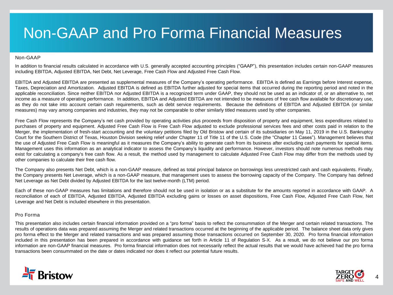 3 Cautionary Statement Regarding Forward-Looking Statements This presentation contains “forward-looking statements.” Forward-looking statements represent Bristow Group Inc.’s (the “Company”) current expectations or forecasts of future events. Forward-looking statements generally can be identified by the use of forward-looking terminology such as “may,” “will,” “expect,” “intend,” “estimate,” “anticipate,” “believe,” “project,” or “continue,” or other similar words. These statements are made under the safe harbor provisions of the Private Securities Litigation Reform Act of 1995, reflect management’s current views with respect to future events and therefore are subject to significant risks and uncertainties, both known and unknown. The Company’s actual results may vary materially from those anticipated in forward-looking statements. The Company cautions investors not to place undue reliance on any forward-looking statements. Forward-looking statements speak only as of the date of the document in which they are made. The Company disclaims any obligation or undertaking to provide any updates or revisions to any forward-looking statement to reflect any change in the Company’s expectations or any change in events, conditions or circumstances on which the forward-looking statement is based that occur after the date hereof. Risks that may affect forward-looking statements include, but are not necessarily limited to, those relating to: the COVID-19 pandemic and related economic repercussions that have resulted, and may continue to result, in a decrease in the price of and demand for oil, which has caused, and may continue to cause, a decrease in the demand for our services; expected cost synergies and other benefits of the merger (the “Merger”) of the entity formerly known as Bristow Group Inc. (“Old Bristow”) and Era Group Inc. (“Era”) might not be realized within the expected time frames, might be less than projected or may not be realized at all; the ability to successfully integrate the operations, accounting and administrative functions of Era and Old Bristow; managing a significantly larger company than before the completion of the Merger; diversion of management time on issues related to integration of the companies; the increase in indebtedness as a result of the Merger; operating costs, customer loss and business disruption following the Merger, including, without limitation, difficulties in maintaining relationships with employees and customers, may be greater than expected; our reliance on a limited number of customers and the reduction of our customer base as a result of bankruptcies or consolidation; risks inherent in operating helicopters; the Company’s ability to maintain an acceptable safety record and level of reliability; the impact of increased U.S. and foreign government regulation and legislation, including potential government implemented moratoriums on drilling activities; the impact of a grounding of all or a portion of the Company’s fleet for extended periods of time or indefinitely on the Company’s business, including its operations and ability to service customers, results of operations or financial condition and/or the market value of the affected helicopters; the Company’s ability to successfully expand into other geographic and aviation service markets; risks associated with political instability, governmental action, war, acts of terrorism and changes in the economic condition in any foreign country where the Company does business, which may result in expropriation, nationalization, confiscation or deprivation of the Company’s assets or result in claims of a force majeure situation; the impact of declines in the global economy and financial markets; the impact of fluctuations in foreign currency exchange rates on the Company’s asset values and cost to purchase helicopters, spare parts and related services; risks related to investing in new lines of aviation service without realizing the expected benefits; risks of engaging in competitive processes or expending significant resources for strategic opportunities, with no guaranty of recoupment; the Company’s reliance on a limited number of helicopter manufacturers and suppliers; the Company’s ongoing need to replace aging helicopters; the Company’s reliance on the secondary helicopter market to dispose of used helicopters and parts; information technology related risks; the impact of allocation of risk between the Company and its customers; the liability, legal fees and costs in connection with providing emergency response services; adverse weather conditions and seasonality; risks associated with the Company’s debt structure; the Company’s counterparty credit risk exposure; the impact of operational and financial difficulties of the Company’s joint ventures and partners and the risks associated with identifying and securing joint venture partners when needed; conflict with the other owners of the Company’s non-wholly owned subsidiaries and other equity investees; adverse results of legal proceedings; risks associated with significant increases in fuel costs; the Company’s ability to obtain insurance coverage and the adequacy and availability of such coverage; the possibility of labor problems; the attraction and retention of qualified personnel; restrictions on the amount of foreign ownership of the Company’s common stock; and various other matters and factors, many of which are beyond the Company’s control. You should not place undue reliance on our forward-looking statements because the matters they describe are subject to known and unknown risks, uncertainties and other unpredictable factors, many of which are beyond our control. Our forward-looking statements are based on the information currently available to us and speak only as of the date hereof. New risks and uncertainties arise from time to time, and it is imposs