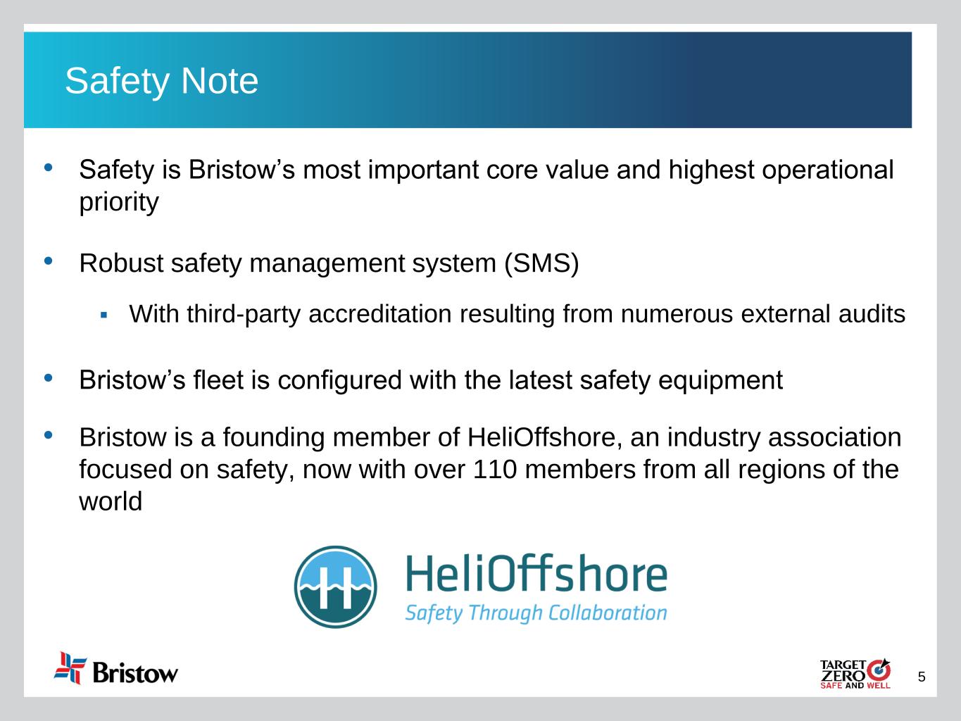 4 Non-GAAP In addition to financial results calculated in accordance with U.S. generally accepted accounting principles (“GAAP”), this presentation includes certain non-GAAP measures including EBITDA, Adjusted EBITDA, Net Debt, Net Leverage, Free Cash Flow and Adjusted Free Cash Flow. EBITDA and Adjusted EBITDA are presented as supplemental measures of the Company’s operating performance. EBITDA is defined as Earnings before Interest expense, Taxes, Depreciation and Amortization. Adjusted EBITDA is defined as EBITDA further adjusted for special items that occurred during the reporting period and noted in the applicable reconciliation. Since neither EBITDA nor Adjusted EBITDA is a recognized term under GAAP, they should not be used as an indicator of, or an alternative to, net income as a measure of operating performance. In addition, EBITDA and Adjusted EBITDA are not intended to be measures of free cash flow available for discretionary use, as they do not take into account certain cash requirements, such as debt service requirements. Because the definitions of EBITDA and Adjusted EBITDA (or similar measures) may vary among companies and industries, they may not be comparable to other similarly titled measures used by other companies. Free Cash Flow represents the Company’s net cash provided by operating activities plus proceeds from disposition of property and equipment, less expenditures related to purchases of property and equipment. Adjusted Free Cash Flow is Free Cash Flow adjusted to exclude professional services fees and other costs paid in relation to the Merger, the implementation of fresh-start accounting and the voluntary petitions filed by Old Bristow and certain of its subsidiaries on May 11, 2019 in the U.S. Bankruptcy Court for the Southern District of Texas, Houston Division seeking relief under Chapter 11 of Title 11 of the U.S. Code (the “Chapter 11 Cases”). Management believes that the use of Adjusted Free Cash Flow is meaningful as it measures the Company’s ability to generate cash from its business after excluding cash payments for special items. Management uses this information as an analytical indicator to assess the Company’s liquidity and performance. However, investors should note numerous methods may exist for calculating a company's free cash flow. As a result, the method used by management to calculate Adjusted Free Cash Flow may differ from the methods used by other companies to calculate their free cash flow. The Company also presents Net Debt, which is a non-GAAP measure, defined as total principal balance on borrowings less unrestricted cash and cash equivalents. Finally, the Company presents Net Leverage, which is a non-GAAP measure, that management uses to assess the borrowing capacity of the Company. The Company has defined Net Leverage as Net Debt divided by Adjusted EBITDA for the last twelve-month (LTM) period. Each of these non-GAAP measures has limitations and therefore should not be used in isolation or as a substitute for the amounts reported in accordance with GAAP. A reconciliation of each of EBITDA, Adjusted EBITDA, Adjusted EBITDA excluding gains or losses on asset dispositions, Free Cash Flow, Adjusted Free Cash Flow, Net Leverage and Net Debt is included elsewhere in this presentation. Pro Forma This presentation also includes certain financial information provided on a “pro forma” basis to reflect the consummation of the Merger and certain related transactions. The results of operations data was prepared assuming the Merger and related transactions occurred at the beginning of the applicable period. The balance sheet data only gives pro forma effect to the Merger and related transactions and was prepared assuming those transactions occurred on September 30, 2020. Pro forma financial information included in this presentation has been prepared in accordance with guidance set forth in Article 11 of Regulation S-X. As a result, we do not believe our pro forma information are non-GAAP financial measures. Pro forma financial information does not necessarily reflect the actual results that we would have achieved had the pro forma transactions been consummated on the date or dates indicated nor does it reflect our potential future results. Non-GAAP and Pro Forma Financial Measures