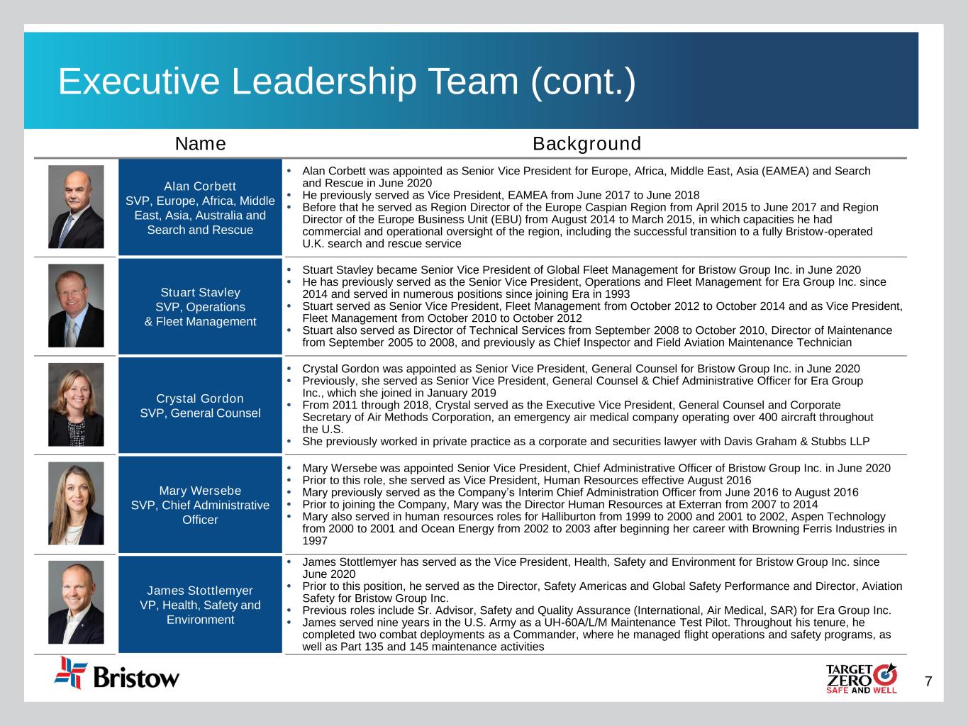 6 Name Background Chris Bradshaw President and Chief Executive Officer Christopher “Chris” Bradshaw has served as the President and Chief Executive Officer of Bristow Group Inc. since June 2020 He previously served as the President and CEO of Era Group Inc. since November 2014 and Chief Financial Officer from October 2012 to September 2015. Chris was appointed a director of Era in February 2015 He served as Era’s Acting Chief Executive Officer from August 2014 to November 2014 From 2009 until 2012, Chris served as Managing Partner and Chief Financial Officer of U.S. Capital Advisors LLC, an independent financial advisory firm that he co-founded Prior to co-founding U.S. Capital Advisors LLC, Chris was an energy investment banker at UBS Securities LLC, Morgan Stanley & Co., and PaineWebber Incorporated David Stepanek EVP, Chief Operating Officer David Stepanek became Bristow’s Executive Vice President, Chief Operating Officer in June 2020 He previously served as Senior Vice President, Business Development of Era Group Inc. when he joined Era in January 2020 From 2010 through 2019, David held positions within PHI, Inc., most recently having served as President, PHI Americas, responsible for the overall performance and direction of PHI’s U.S. and international operations in the Western Hemisphere. David previously served as Chief Commercial Officer of PHI, Inc. After four years’ service in the US Marine Corps as a heavy lift helicopter avionics technician, David moved to Sikorsky as an avionics technician and field service representative; he was subsequently promoted and contributed to the sales and product development of the S-76 and S-92 aircraft, amongst many other roles Jennifer Whalen SVP, Chief Financial Officer Jennifer Whalen has served as Senior Vice President, Chief Financial Officer for Bristow Group Inc. since June 2020 Previously, she served as the Senior Vice President, Chief Financial Officer, for Era Group Inc. since February 2018 Jennifer served as the Company's Vice President and Chief Accounting Officer from August 2013 until her appointment as Vice President, Acting Chief Financial Officer in June 2017 From August 2007 to March 2012, Jennifer served in several capacities at nLIGHT Photonics Corporation, a supplier of high-performance lasers, including as Director of Accounting Prior to these roles, Jennifer served as the Manager of Accounting at InFocus Corporation for over two years After serving in the U.S. military, Jennifer started her career in public accounting in the assurance practice group at PricewaterhouseCoopers for approximately five years Samantha Willenbacher SVP, Chief Commercial Officer Samantha “Sam” Willenbacher was appointed as the Senior Vice President, Chief Commercial Officer of Bristow Group Inc. in June 2020 Sam previously served as Vice President, Global Commercial Strategy for Bristow She has also held key leadership roles for Bristow as the Vice President, Global Commercial Strategy; Director, Americas Region; and the Director of UK Search and Rescue Sam has also served as the Business Development Manager and later the Director of the Bristow Academy, at the time the world’s largest helicopter flight training school She joined the Company in May 1998 through employment with Helicopter Adventures Inc., which later became the Bristow Academy Executive Leadership Team