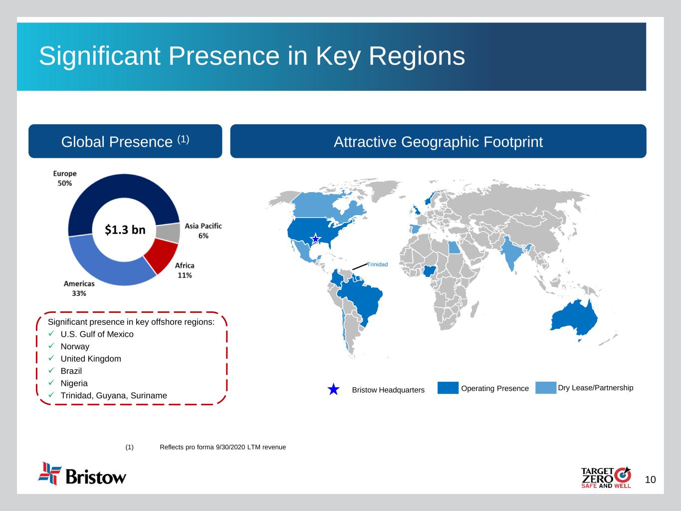 9 Global Leadership Position in Helicopter Industry Aircraft Fleet (3) Pro Forma LTM Revenue by Region (1)• Bristow and Era merged on June 11, 2020, forming a larger, more diverse industry leader ▪ Bristow was the accounting acquirer ▪ Periods prior to the merger only include operating results of legacy Bristow Group Inc. • Bristow remains headquartered in Houston, TX and publicly traded on the NYSE (Ticker: VTOL) • Pro forma LTM revenues of $1.3 billion(1) • Global leader in offshore oil and gas personnel transportation, with significant end market diversification from government services contracts including UK SAR • 3,294 employees, including 915 pilots and 943 mechanics(2) • Diverse fleet of 257 aircraft(3) ▪ Mostly owned (~80%) with attractive lease rates on the balance of the fleet (1) Reflects pro forma 9/30/2020 LTM revenue; see page 59 for reconciliation (2) As of 9/30/2020 (3) As of 11/30/2020 257 $1.3 bn