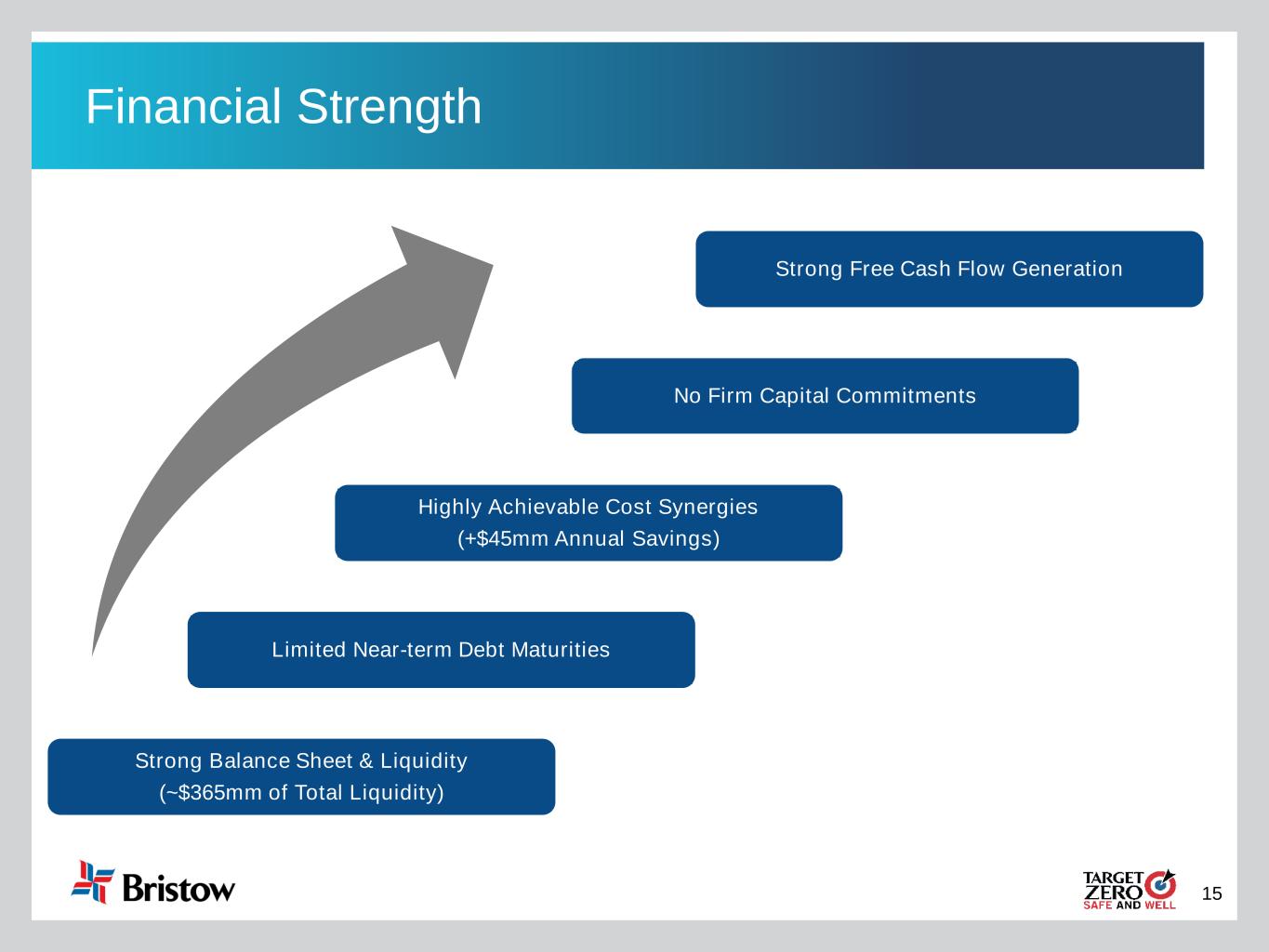 14 Strong Balance Sheet and Financial Flexibility (1) Cash, Net Debt and Total Liquidity reflect preliminary results as of November 30, 2020 (2) See page 57 for reconciliation of LTM Adjusted EBITDA (3) “Net Capex” is defined as net (proceeds from)/purchases of property and equipment. See page 58 for reconciliation of Adjusted Free Cash Flow Strong Balance Sheet (1) Financial Flexibility $366mm • Bristow generated $57 million of Adjusted Free Cash Flow excluding Net Capex(3) in the three months ended September 30, 2020 • All of the Company's unfunded capital commitments may be canceled without further liability other than forfeiture of previously paid deposits of $2.1 million • On September 16, 2020, the Board authorized a stock repurchase plan providing for the repurchase of $75 million of the Company’s common stock. Since that time, Bristow has repurchased 448,252 shares at an average purchase price of $22.29 per share • In November, Bristow repurchased $12.1 million (face value) of the 7.75% Senior Notes at 97.5, reducing the outstanding face value to $132.0 million and lowering annual interest expense by ~$1 million annually • Total available liquidity as of November 30, 2020 was $366 million • Net Debt of $374 million as of November 30, 2020 • Pro Forma LTM Adjusted EBITDA of $186 million(2) for the 12 months ended September 30, 2020 • Net Leverage is ~2.0x $683mm $374mm