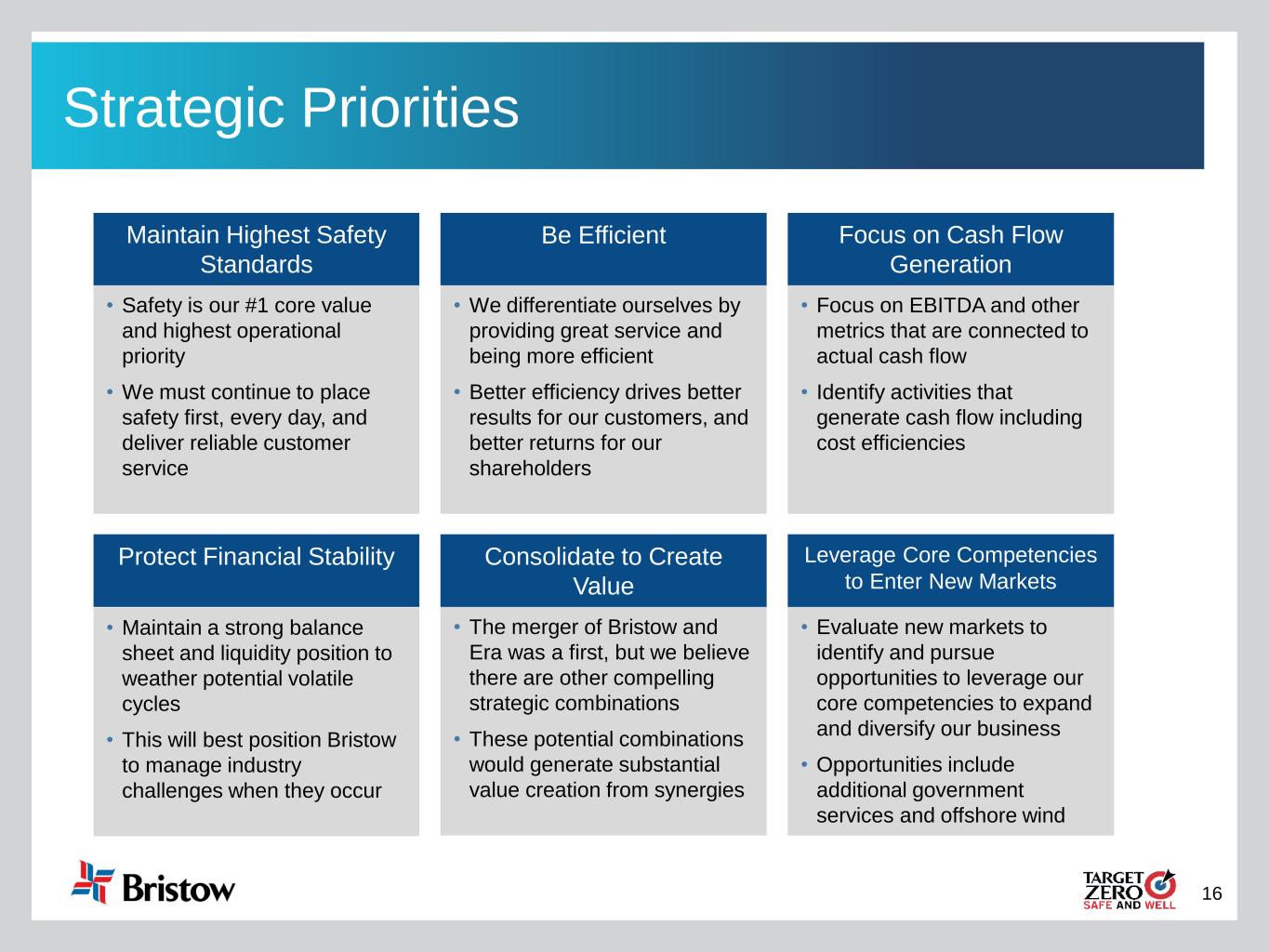 16 Strategic Priorities Maintain Highest Safety Standards • Safety is our #1 core value and highest operational priority • We must continue to place safety first, every day, and deliver reliable customer service Be Efficient Focus on Cash Flow Generation Protect Financial Stability Consolidate to Create Value Leverage Core Competencies to Enter New Markets • We differentiate ourselves by providing great service and being more efficient • Better efficiency drives better results for our customers, and better returns for our shareholders • Focus on EBITDA and other metrics that are connected to actual cash flow • Identify activities that generate cash flow including cost efficiencies • Maintain a strong balance sheet and liquidity position to weather potential volatile cycles • This will best position Bristow to manage industry challenges when they occur • Evaluate new markets to identify and pursue opportunities to leverage our core competencies to expand and diversify our business • Opportunities include additional government services and offshore wind • The merger of Bristow and Era was a first, but we believe there are other compelling strategic combinations • These potential combinations would generate substantial value creation from synergies