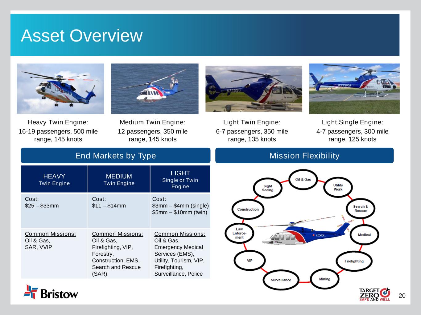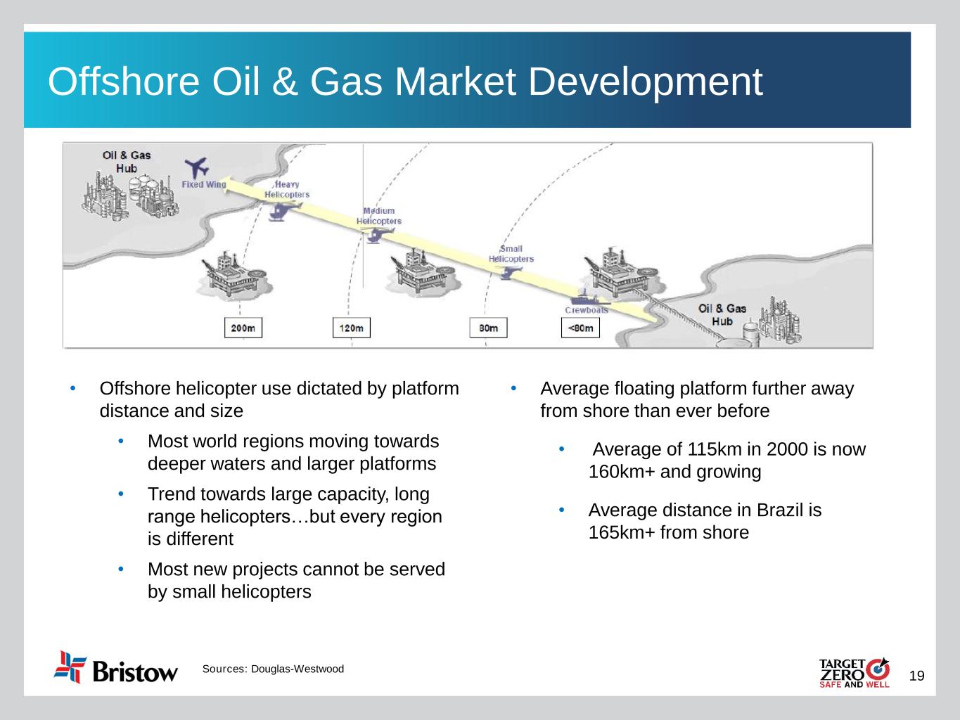 19 Offshore Oil & Gas Market Development • Offshore helicopter use dictated by platform distance and size • Most world regions moving towards deeper waters and larger platforms • Trend towards large capacity, long range helicopters…but every region is different • Most new projects cannot be served by small helicopters Sources: Douglas-Westwood • Average floating platform further away from shore than ever before • Average of 115km in 2000 is now 160km+ and growing • Average distance in Brazil is 165km+ from shore