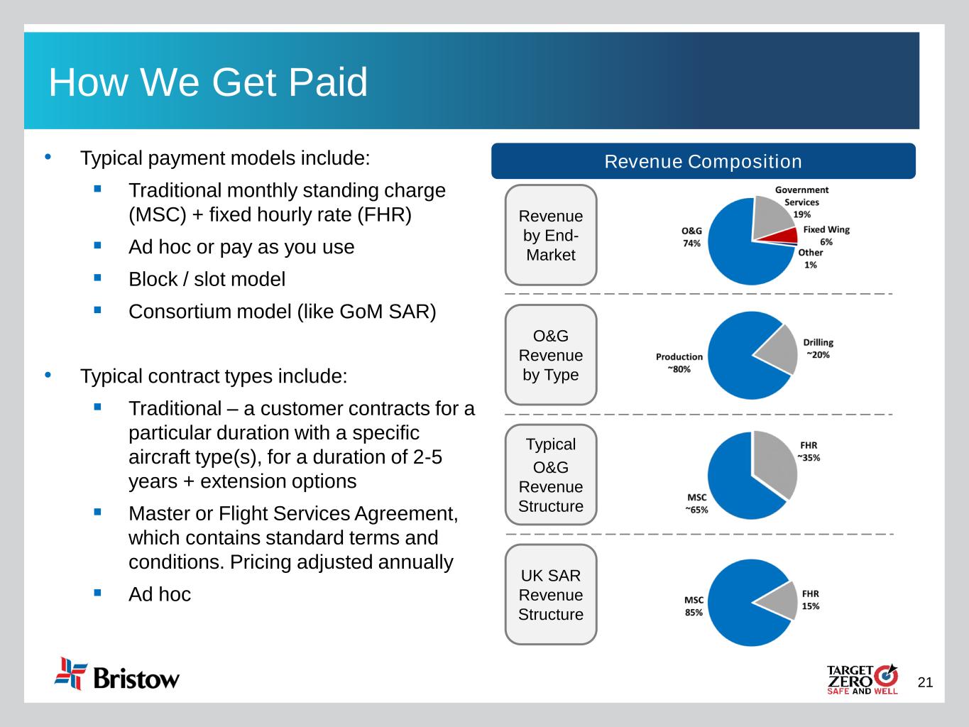 21 How We Get Paid • Typical payment models include: ▪ Traditional monthly standing charge (MSC) + fixed hourly rate (FHR) ▪ Ad hoc or pay as you use ▪ Block / slot model ▪ Consortium model (like GoM SAR) • Typical contract types include: ▪ Traditional – a customer contracts for a particular duration with a specific aircraft type(s), for a duration of 2-5 years + extension options ▪ Master or Flight Services Agreement, which contains standard terms and conditions. Pricing adjusted annually ▪ Ad hoc Revenue Composition Typical O&G Revenue Structure O&G Revenue by Type UK SAR Revenue Structure Revenue by End- Market