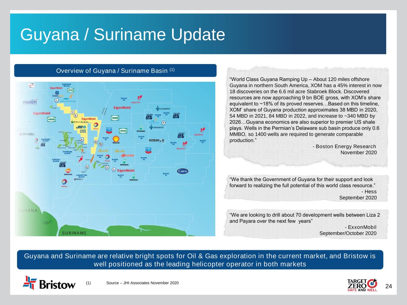 24 Guyana / Suriname Update Overview of Guyana / Suriname Basin (1) “We are looking to drill about 70 development wells between Liza 2 and Payara over the next few years” - ExxonMobil September/October 2020 “World Class Guyana Ramping Up – About 120 miles offshore Guyana in northern South America, XOM has a 45% interest in now 18 discoveries on the 6.6 mil acre Stabroek Block. Discovered resources are now approaching 9 bn BOE gross, with XOM’s share equivalent to ~18% of its proved reserves…Based on this timeline, XOM’ share of Guyana production approximates 38 MBD in 2020, 54 MBD in 2021, 84 MBD in 2022, and increase to ~340 MBD by 2026…Guyana economics are also superior to premier US shale plays. Wells in the Permian’s Delaware sub basin produce only 0.6 MMBO, so 1400 wells are required to generate comparable production.” - Boston Energy Research November 2020 “We thank the Government of Guyana for their support and look forward to realizing the full potential of this world class resource.” - Hess September 2020 Guyana and Suriname are relative bright spots for Oil & Gas exploration in the current market, and Bristow is well positioned as the leading helicopter operator in both markets (1) Source – JHI Associates November 2020