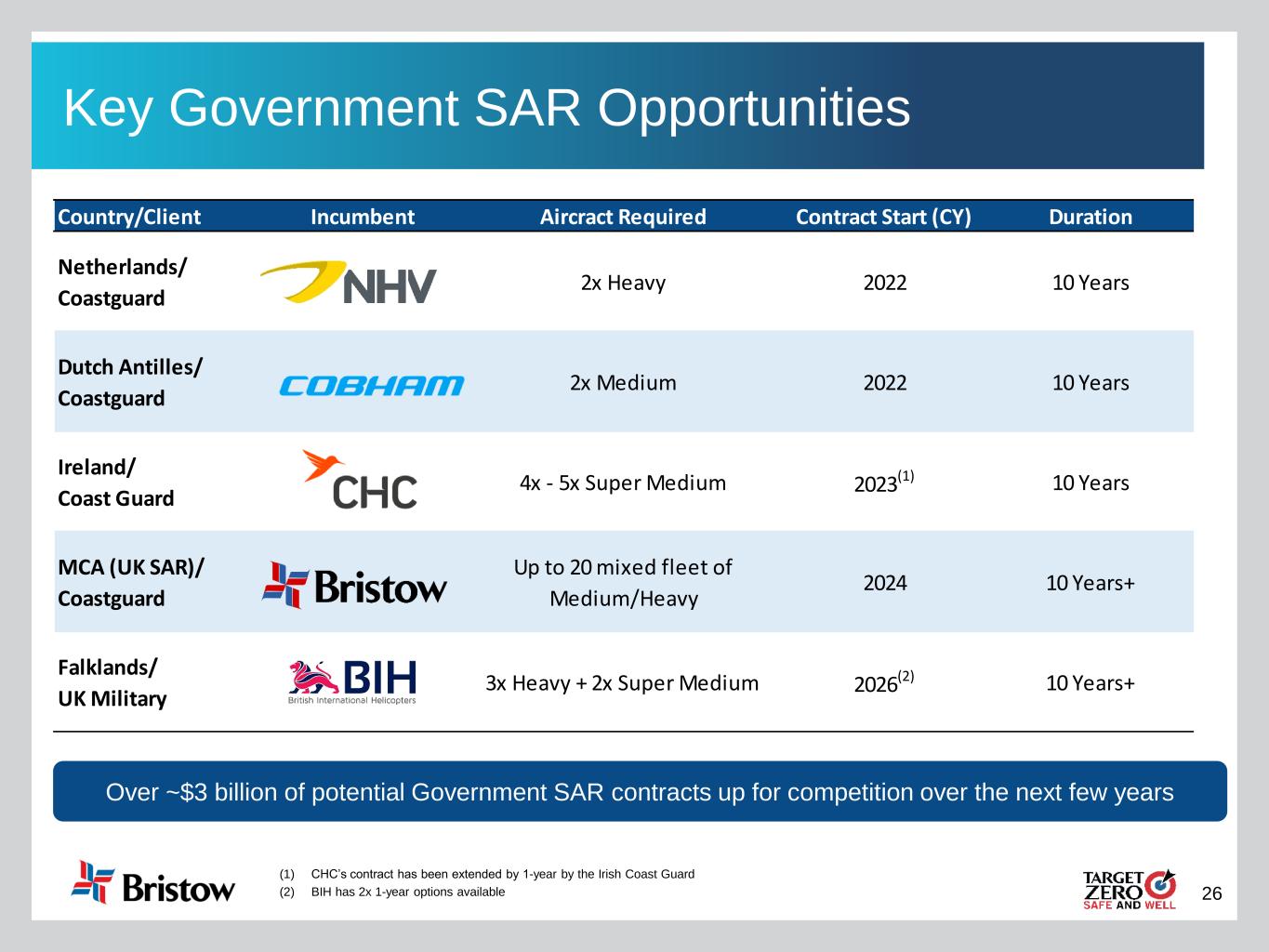 26 Country/Client Incumbent Aircract Required Contract Start (CY) Duration Netherlands/ Coastguard 2x Heavy 2022 10 Years Dutch Antilles/ Coastguard 2x Medium 2022 10 Years Ireland/ Coast Guard 4x - 5x Super Medium 2023 (1) 10 Years MCA (UK SAR)/ Coastguard Up to 20 mixed fleet of Medium/Heavy 2024 10 Years+ Falklands/ UK Military 3x Heavy + 2x Super Medium 2026 (2) 10 Years+ Key Government SAR Opportunities (1) CHC’s contract has been extended by 1-year by the Irish Coast Guard (2) BIH has 2x 1-year options available Over ~$3 billion of potential Government SAR contracts up for competition over the next few years