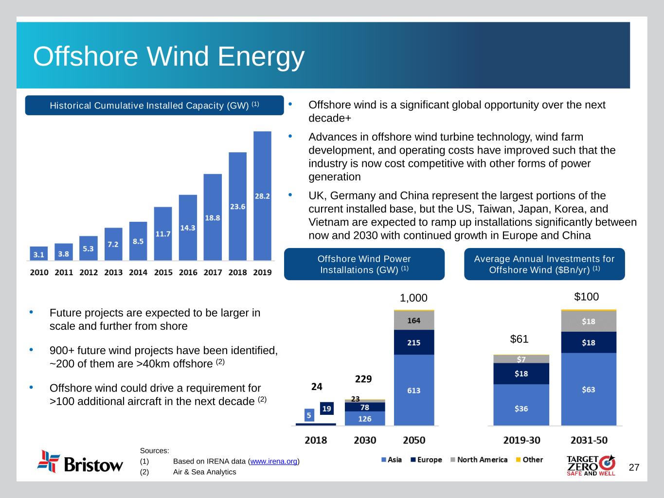 27 Offshore Wind Energy • Offshore wind is a significant global opportunity over the next decade+ • Advances in offshore wind turbine technology, wind farm development, and operating costs have improved such that the industry is now cost competitive with other forms of power generation • UK, Germany and China represent the largest portions of the current installed base, but the US, Taiwan, Japan, Korea, and Vietnam are expected to ramp up installations significantly between now and 2030 with continued growth in Europe and China Sources: (1) Based on IRENA data (www.irena.org) (2) Air & Sea Analytics Historical Cumulative Installed Capacity (GW) (1) Offshore Wind Power Installations (GW) (1) Average Annual Investments for Offshore Wind ($Bn/yr) (1) • Future projects are expected to be larger in scale and further from shore • 900+ future wind projects have been identified, ~200 of them are >40km offshore (2) • Offshore wind could drive a requirement for >100 additional aircraft in the next decade (2) 24 229 1,000 $61 $100