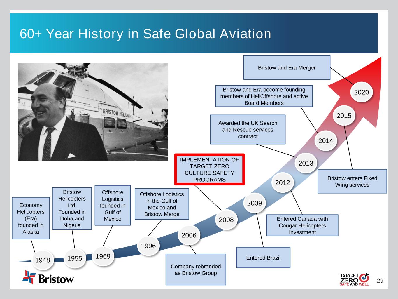 29 60+ Year History in Safe Global Aviation 1955 Bristow Helicopters Ltd. Founded in Doha and Nigeria 1969 1996 2006 2014 Offshore Logistics founded in Gulf of Mexico Company rebranded as Bristow Group 2009 2012 Entered Canada with Cougar Helicopters Investment 2008 IMPLEMENTATION OF TARGET ZERO CULTURE SAFETY PROGRAMS 2015 Entered Brazil Bristow and Era become founding members of HeliOffshore and active Board Members 2020 Offshore Logistics in the Gulf of Mexico and Bristow Merge Bristow enters Fixed Wing services 2013 Awarded the UK Search and Rescue services contract Bristow and Era Merger 1948 Economy Helicopters (Era) founded in Alaska