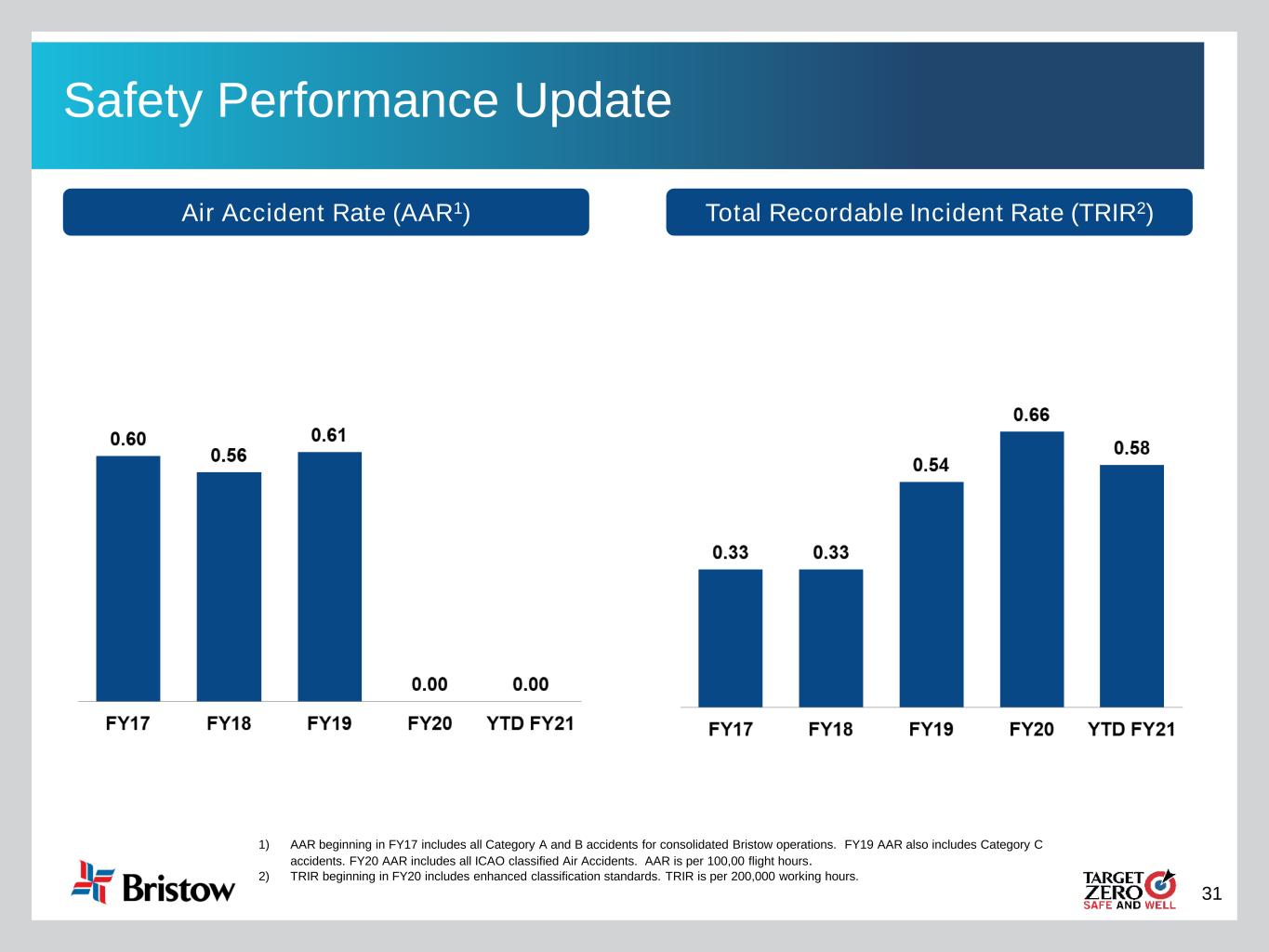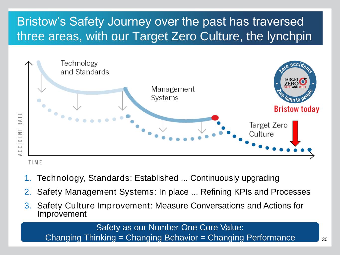 30 Bristow’s Safety Journey over the past has traversed three areas, with our Target Zero Culture, the lynchpin 1. Technology, Standards: Established ... Continuously upgrading 2. Safety Management Systems: In place ... Refining KPIs and Processes 3. Safety Culture Improvement: Measure Conversations and Actions for Improvement Safety as our Number One Core Value: Changing Thinking = Changing Behavior = Changing Performance