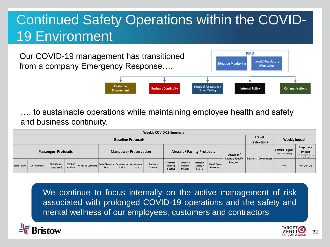 31 Safety Performance Update Air Accident Rate (AAR1) Total Recordable Incident Rate (TRIR2) 1) AAR beginning in FY17 includes all Category A and B accidents for consolidated Bristow operations. FY19 AAR also includes Category C accidents. FY20 AAR includes all ICAO classified Air Accidents. AAR is per 100,00 flight hours. 2) TRIR beginning in FY20 includes enhanced classification standards. TRIR is per 200,000 working hours.