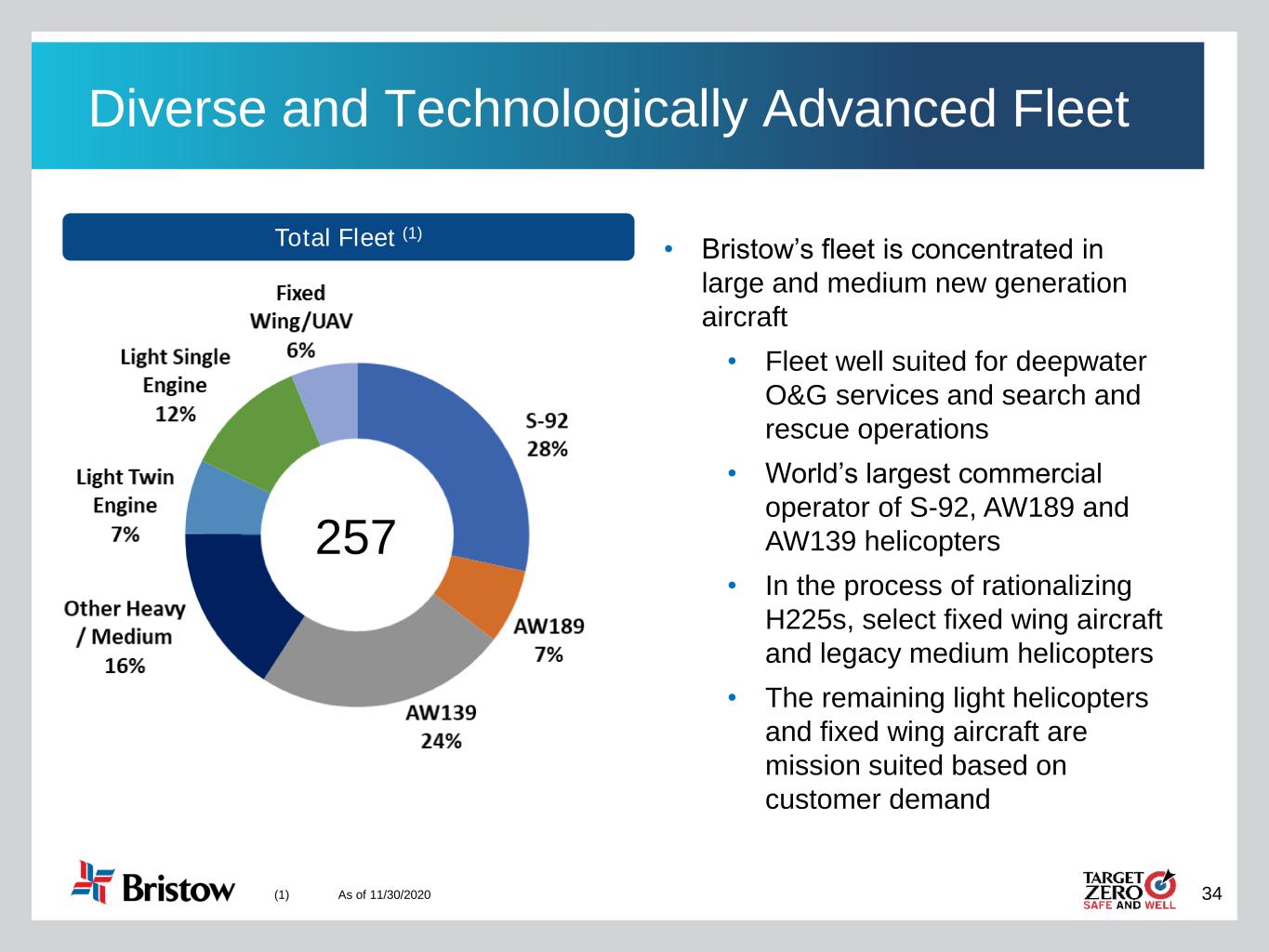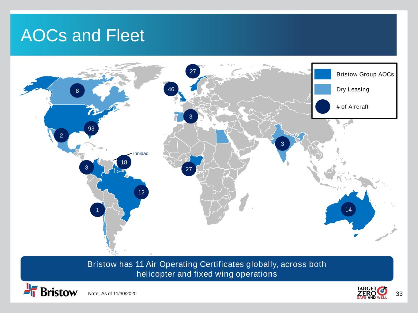 33 AOCs and Fleet Trinidad 14 3 27 3 27 8 93 12 2 Bristow Group AOCs Dry Leasing # of Aircraft Bristow has 11 Air Operating Certificates globally, across both helicopter and fixed wing operations Note: As of 11/30/2020 18 46 3 1