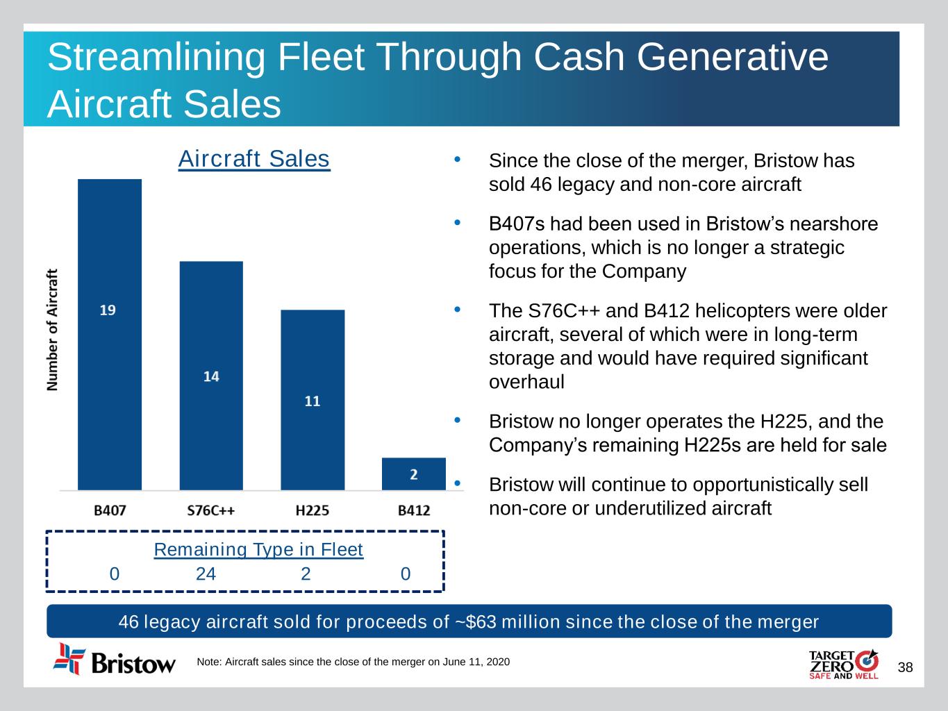 38 Streamlining Fleet Through Cash Generative Aircraft Sales 46 legacy aircraft sold for proceeds of ~$63 million since the close of the merger • Since the close of the merger, Bristow has sold 46 legacy and non-core aircraft • B407s had been used in Bristow’s nearshore operations, which is no longer a strategic focus for the Company • The S76C++ and B412 helicopters were older aircraft, several of which were in long-term storage and would have required significant overhaul • Bristow no longer operates the H225, and the Company’s remaining H225s are held for sale • Bristow will continue to opportunistically sell non-core or underutilized aircraft Aircraft Sales Note: Aircraft sales since the close of the merger on June 11, 2020 0 24 2 Remaining Type in Fleet 0