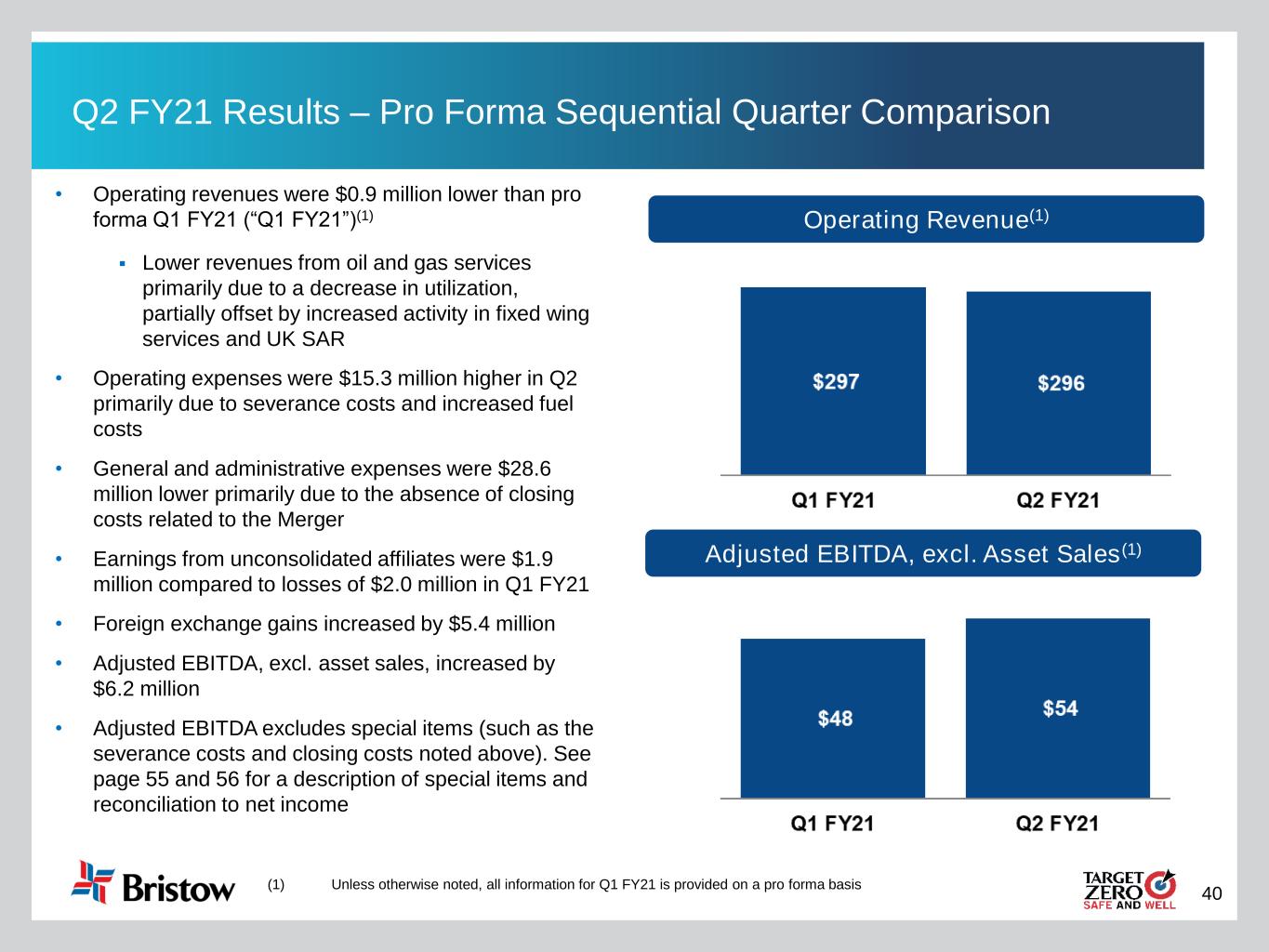 40 Q2 FY21 Results – Pro Forma Sequential Quarter Comparison Adjusted EBITDA, excl. Asset Sales(1) Operating Revenue(1) • Operating revenues were $0.9 million lower than pro forma Q1 FY21 (“Q1 FY21”)(1) ▪ Lower revenues from oil and gas services primarily due to a decrease in utilization, partially offset by increased activity in fixed wing services and UK SAR • Operating expenses were $15.3 million higher in Q2 primarily due to severance costs and increased fuel costs • General and administrative expenses were $28.6 million lower primarily due to the absence of closing costs related to the Merger • Earnings from unconsolidated affiliates were $1.9 million compared to losses of $2.0 million in Q1 FY21 • Foreign exchange gains increased by $5.4 million • Adjusted EBITDA, excl. asset sales, increased by $6.2 million • Adjusted EBITDA excludes special items (such as the severance costs and closing costs noted above). See page 55 and 56 for a description of special items and reconciliation to net income (1) Unless otherwise noted, all information for Q1 FY21 is provided on a pro forma basis
